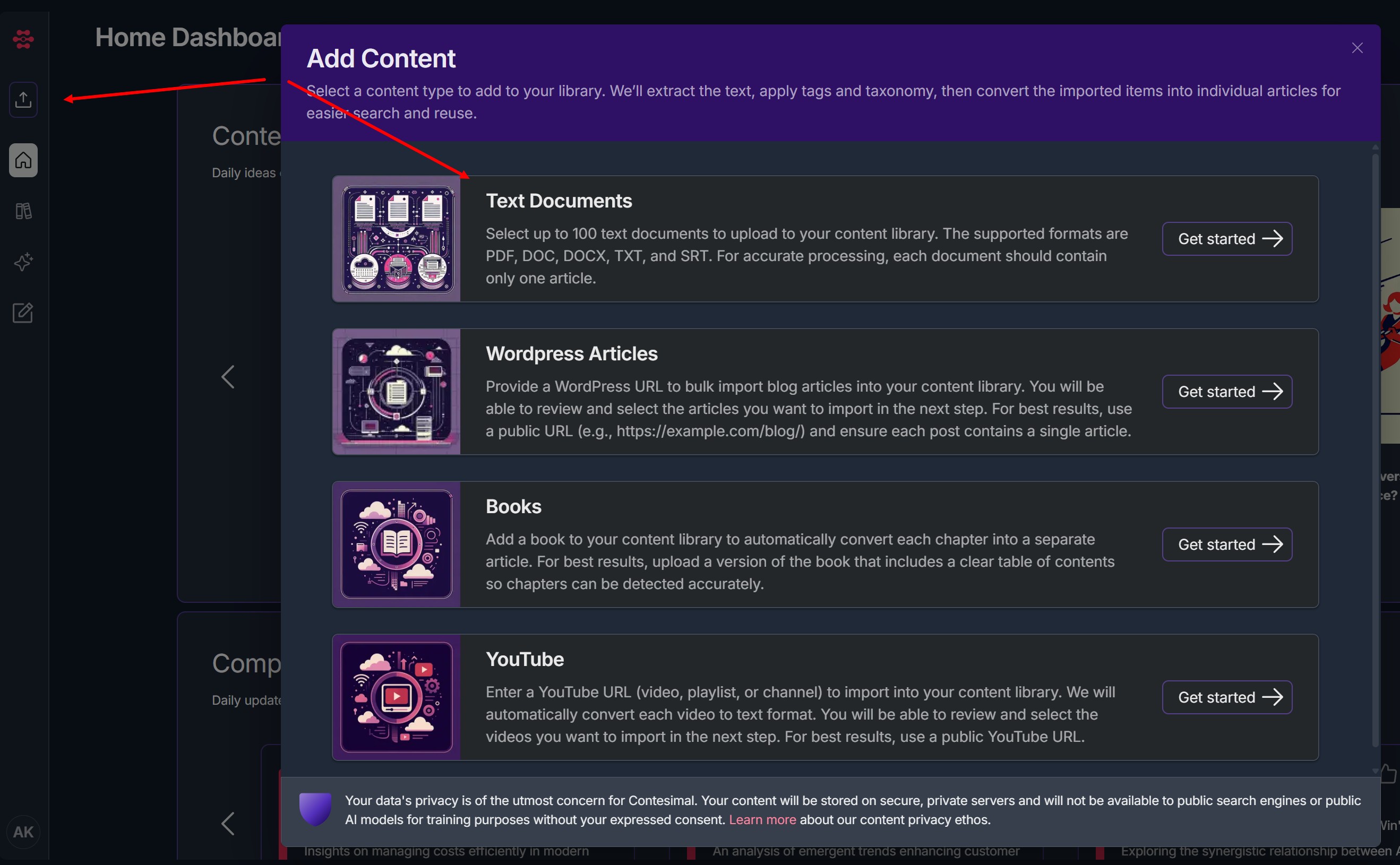 The Text Documents Import feature within Contesimal allows users to seamlessly upload and ingest written content from their local files directly into the Contesimal content library. This powerful tool transforms standalone documents into indexed, searchable, and AI-ready assets, enabling users to centralize their knowledge base in one intelligent workspace.