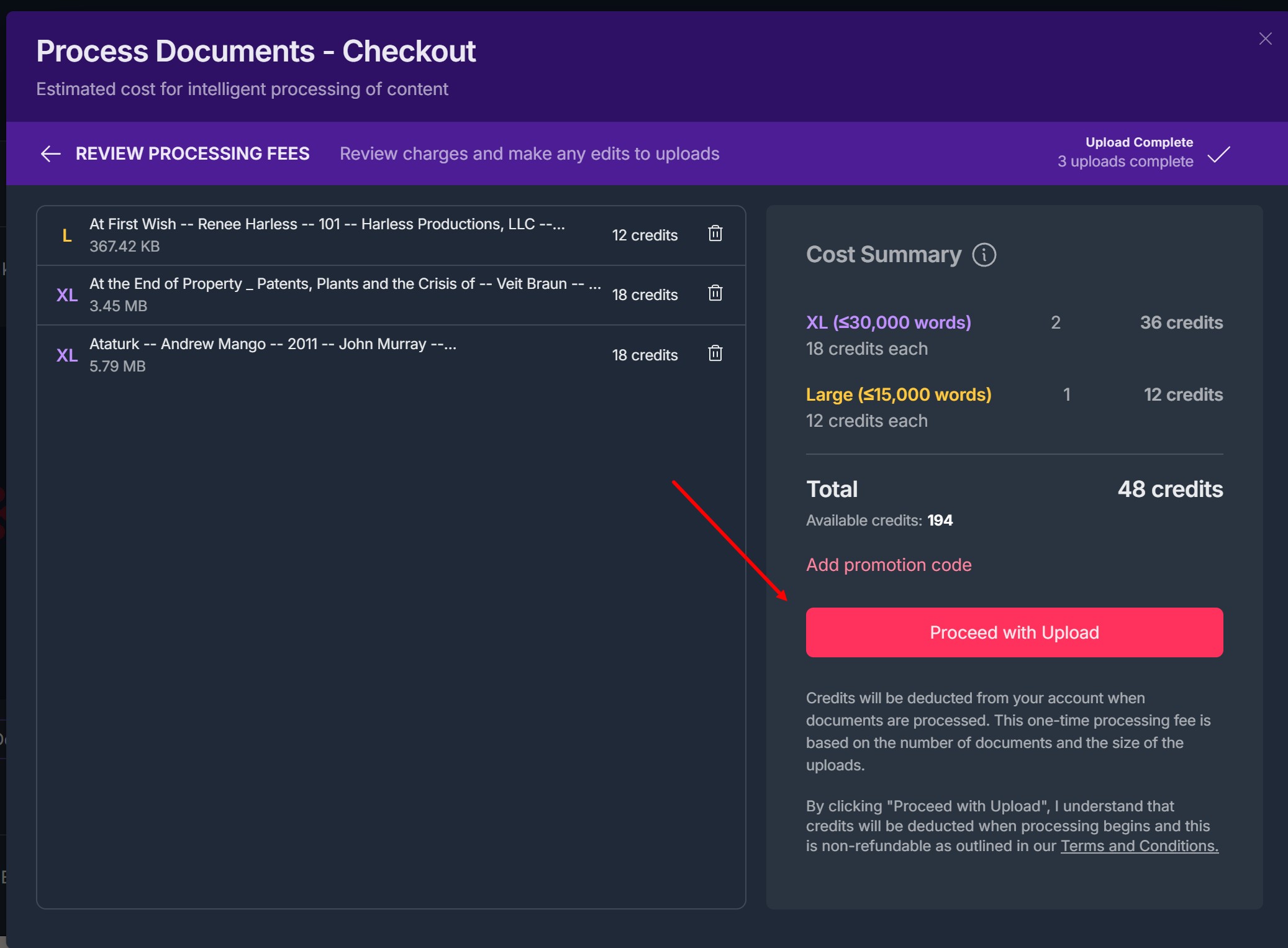 Remove any uploaded documents by clicking trash icon to the right of document title or click drag and drop area/drag and drop new files to add and upload