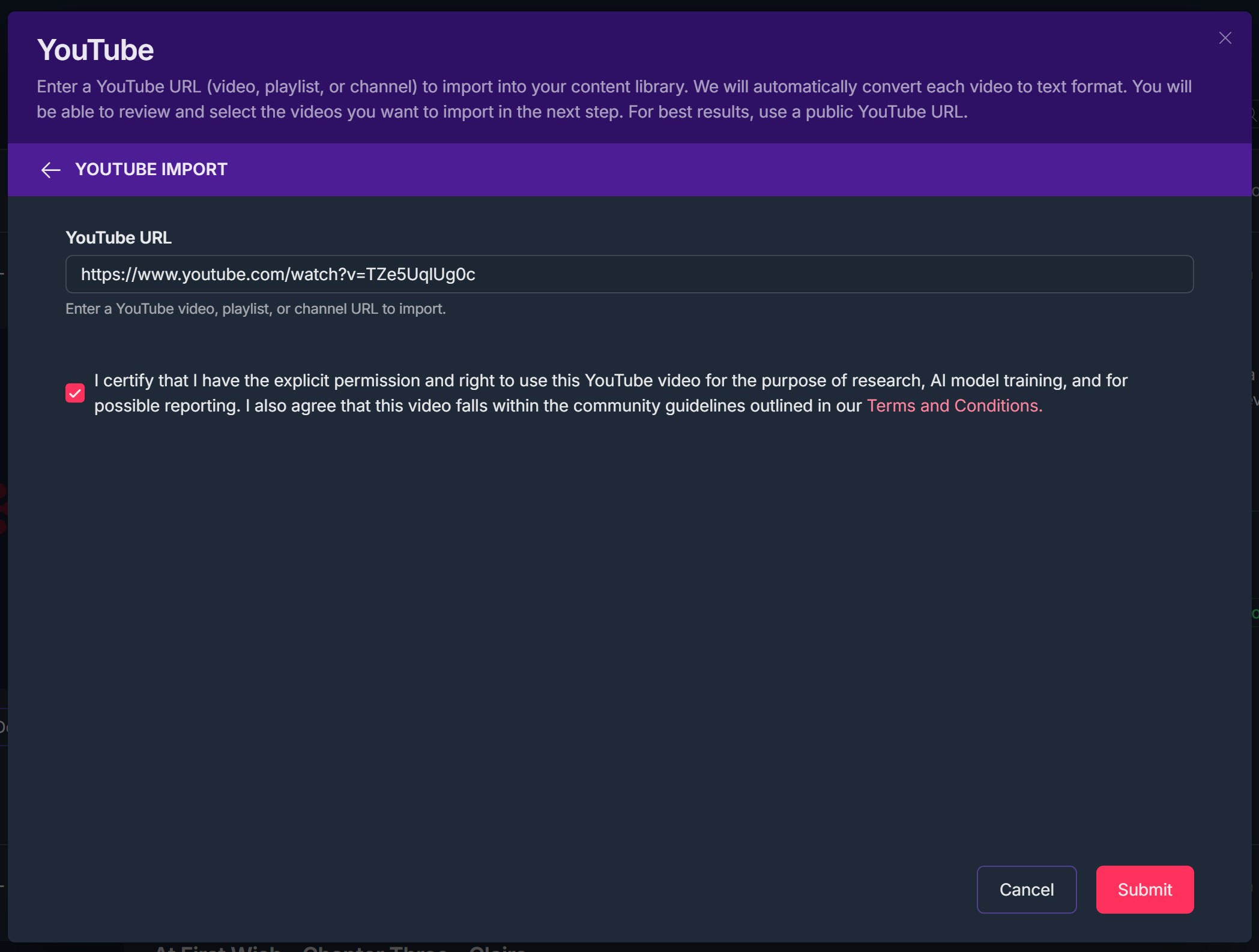 The Import YouTube feature within Contesimal allows users to seamlessly bring video content from YouTube into the Content Library and transform it into text-based, AI-ready assets. By entering a YouTube URL - whether for a single video, an entire playlist, or a channel - Contesimal automatically converts each video into text format, making it fully searchable, indexable, and ready for deeper analysis.