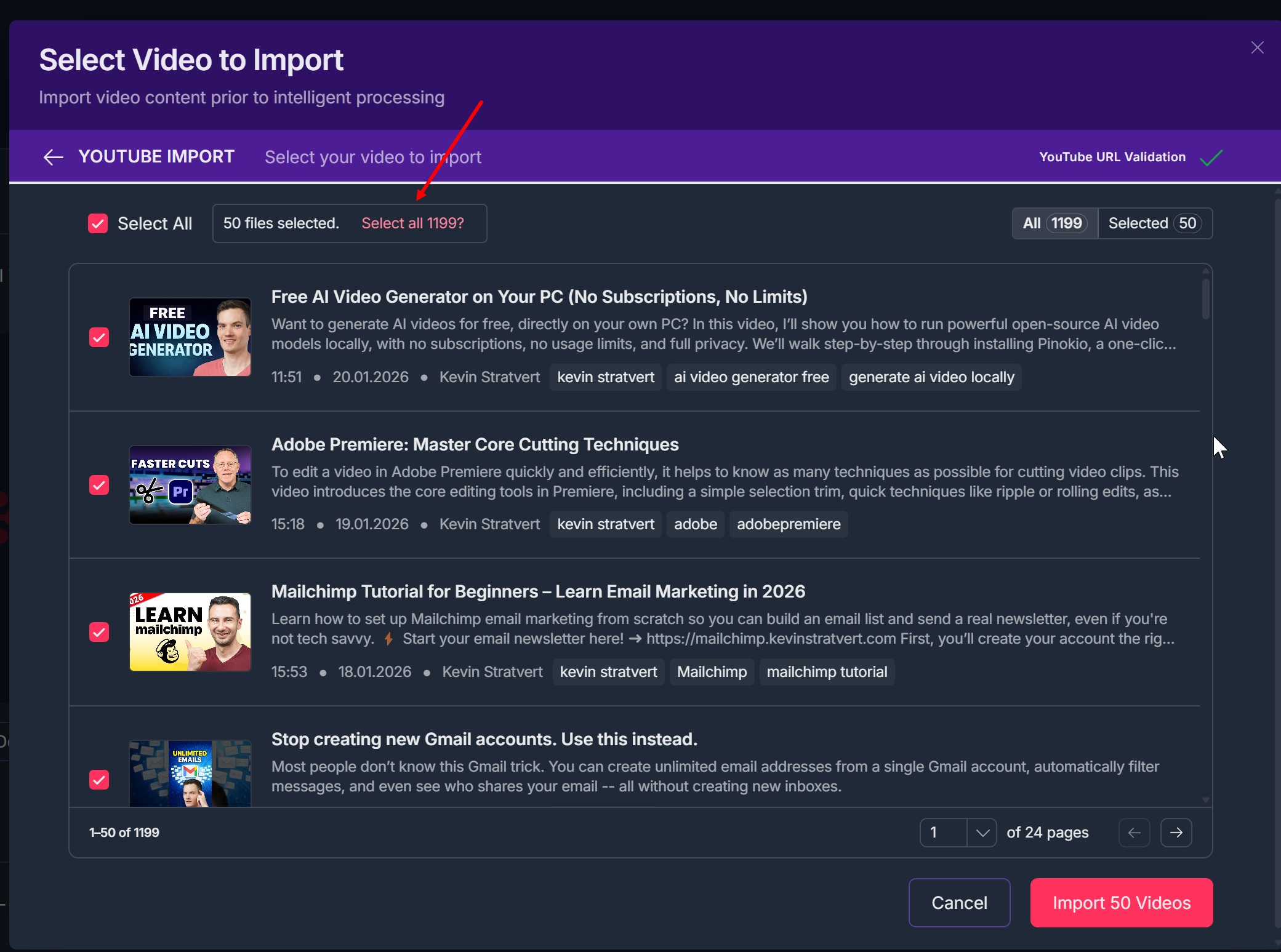 Use checkboxes to select individual videos or choose “Select All” to batch import.