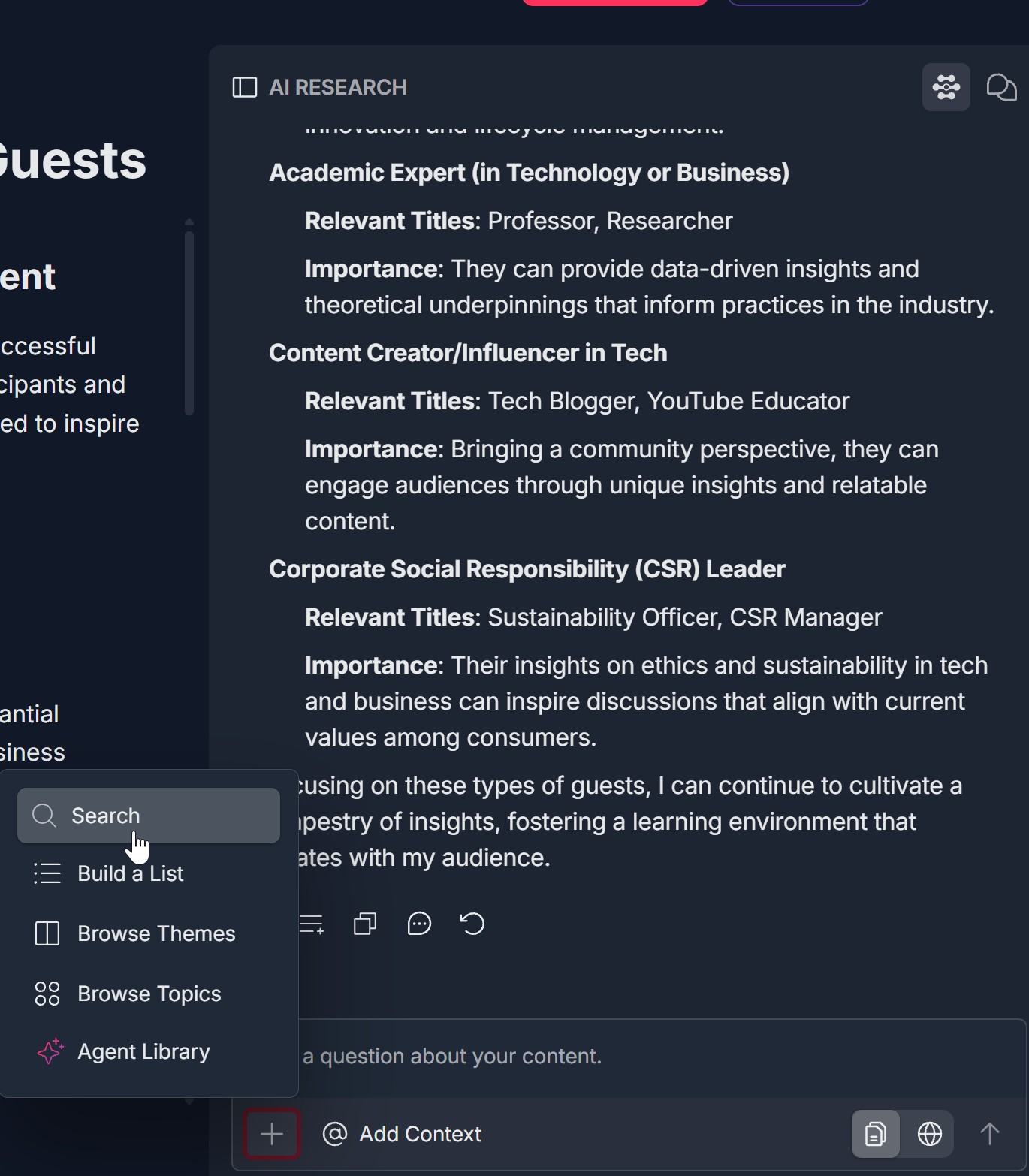 - Click the + icon at the bottom of the AI RESEARCH panel (a red circular button with a white plus)