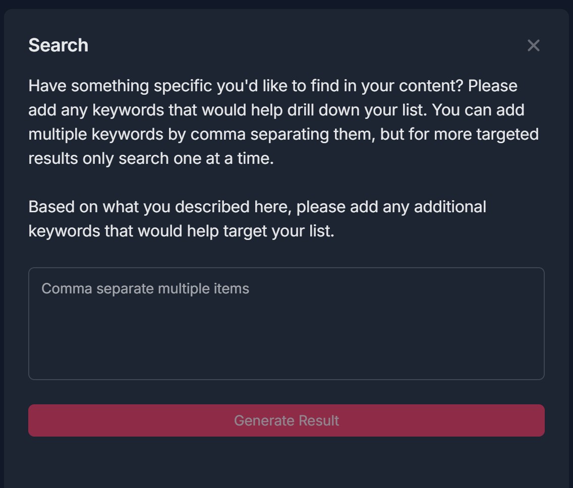 - The modal shows: Title "Search" at top left; X button at top right; Instructions (two paragraphs about keywords and comma-separating, one at a time for targeted results, and additional keywords); Input field "Comma separate multiple items"; Generate Result button at bottom