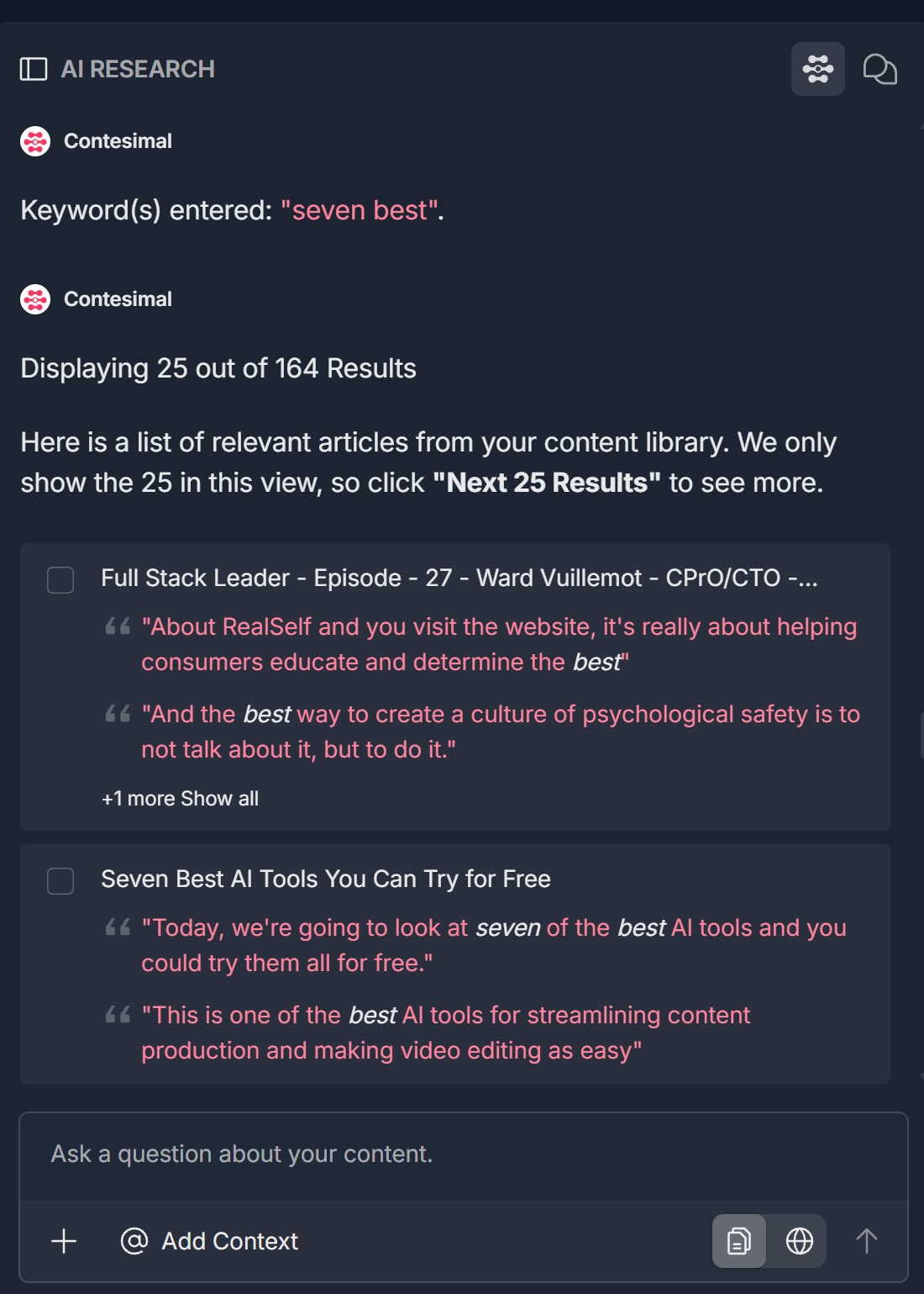 - Scroll to see more results; use Next 25 Results to load the next page; footer has input "Ask a question about your content.", +, @ Add Context, document icon (save to list), globe icon (add to canvas)