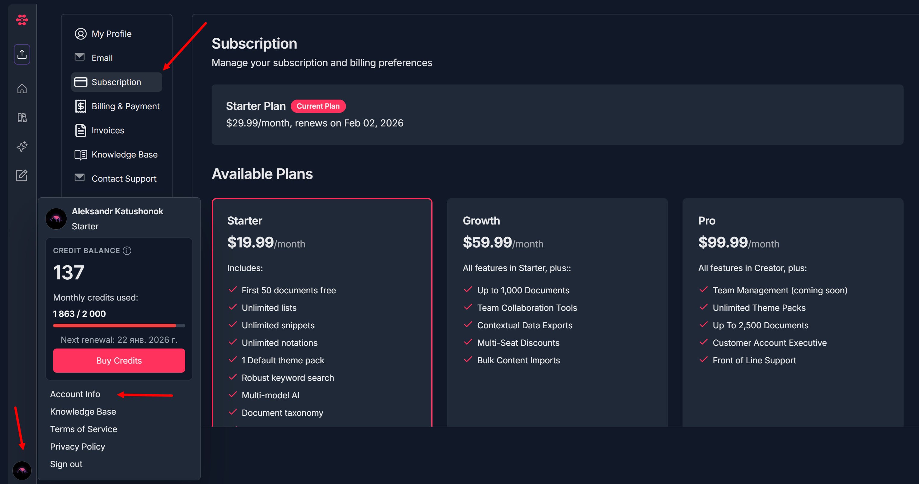 - In Available Plans, review the plan cards (e.g., Starter / Growth / Pro).