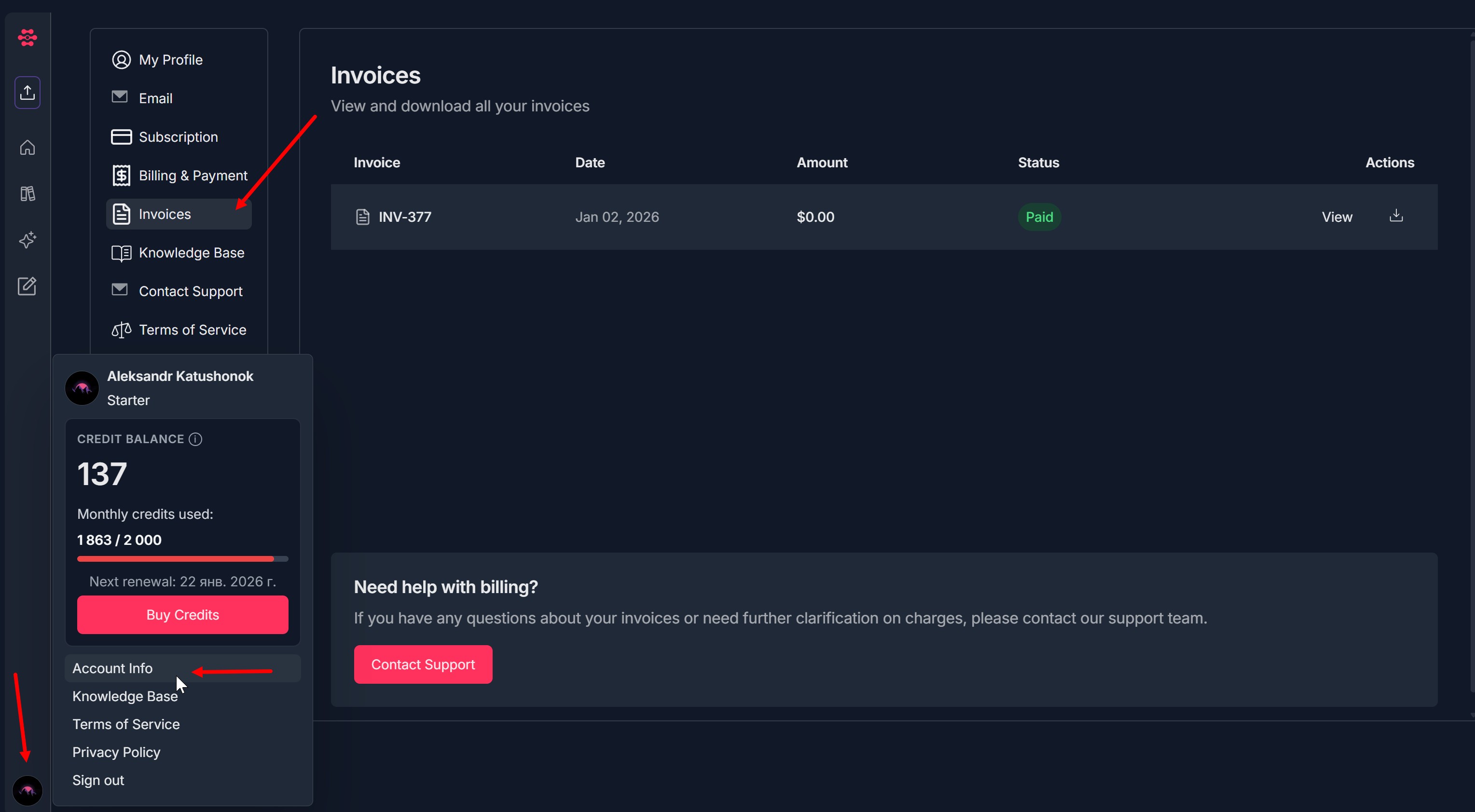 - Click Contact Support and send your question (include the invoice number and attach invoice if needed).