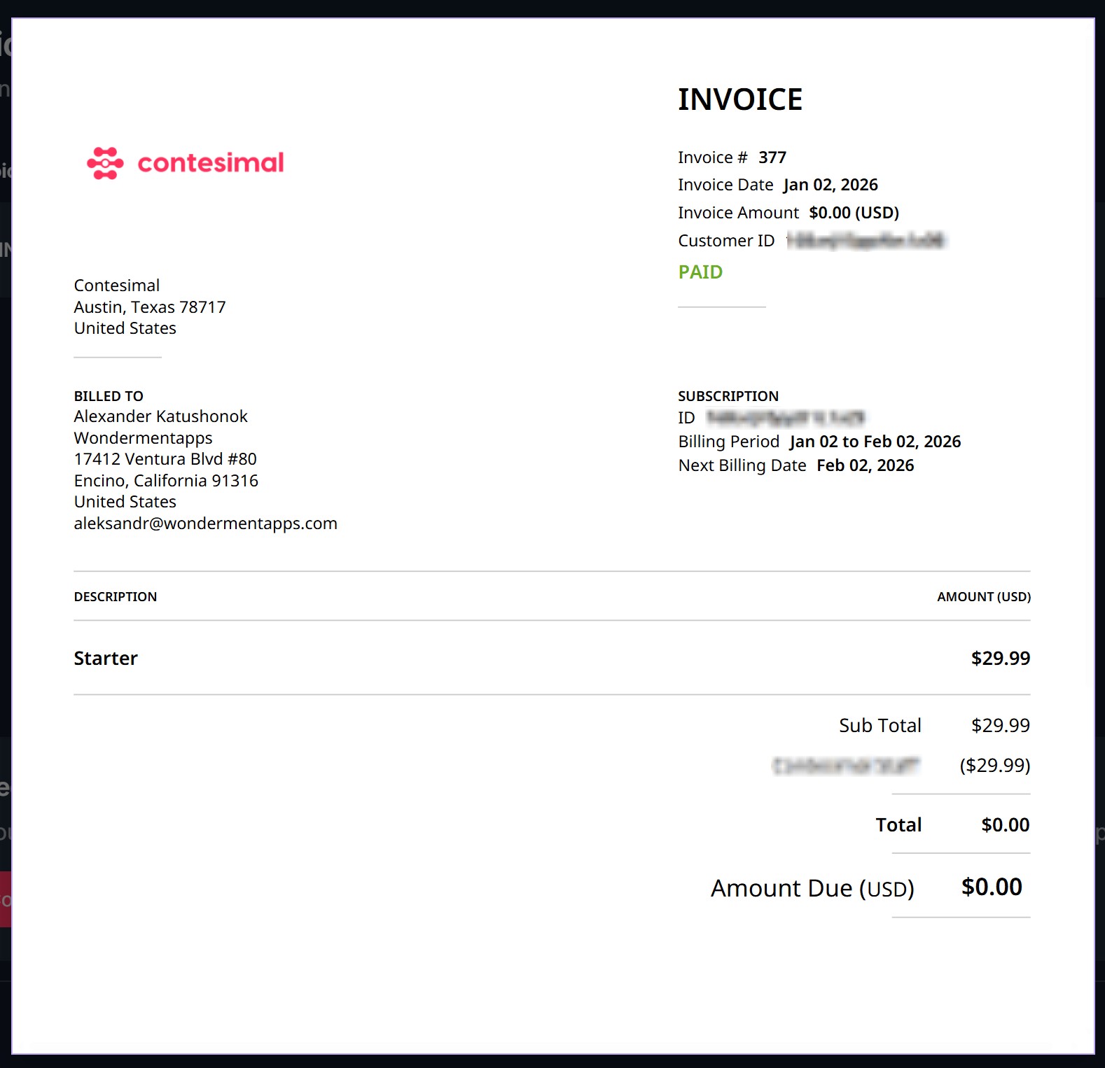 The Invoices page lets you view and manage all invoices for your Contesimal subscription. From here you can: