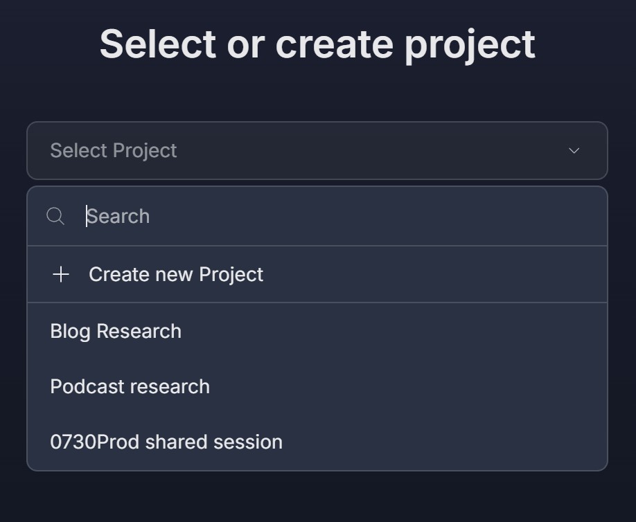 Issue: The "Select or create project" dropdown doesn't open, or no projects are listed.