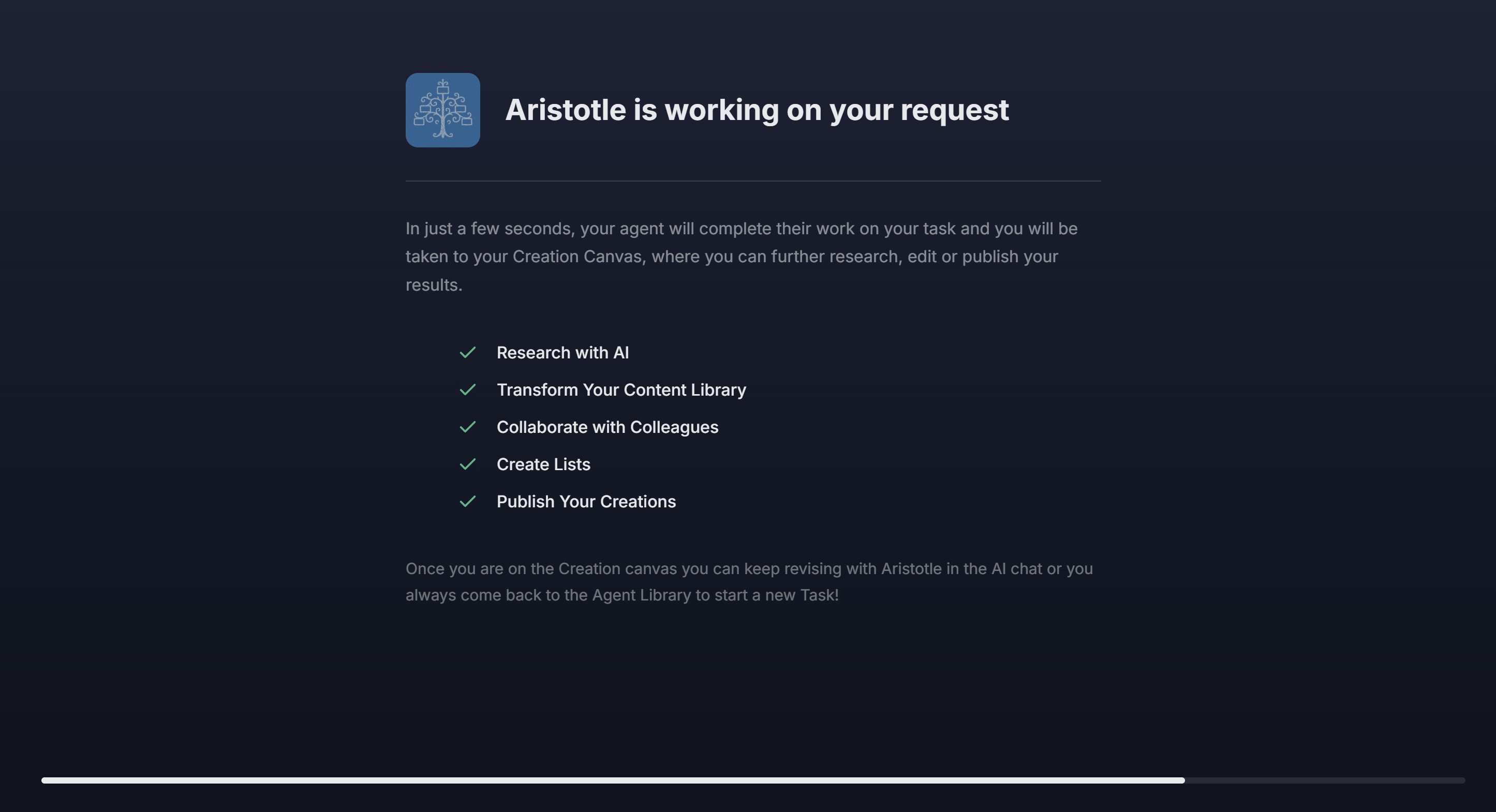 - Once Aristotle Agent completes the research, you'll be automatically redirected to the Creation Canvas