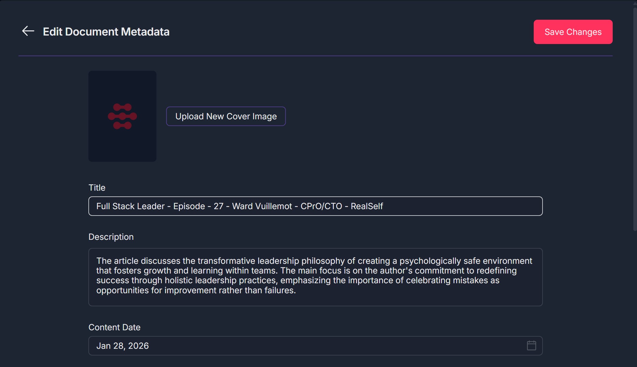 - The modal shows: A back arrow and title "Edit Document Metadata" at the top left; A red Save Changes button at the top right; A cover image section: placeholder (or current image) on the left and an Upload New Cover Image button (with purple outline) on the right; Title, Description, and Content Date fields below