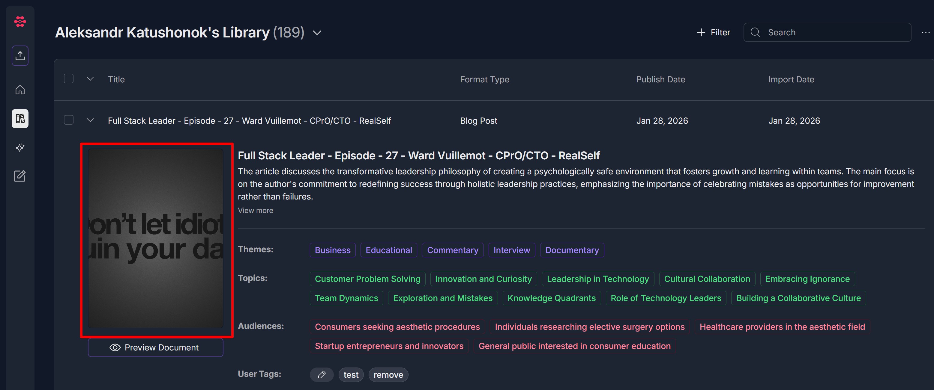- The document detail section will show: Document title, description, and metadata (Themes, Topics, Audiences); A placeholder or current cover image on the left (e.g., a default red icon); The Preview Document button below the image; On the right side of the document row: an information (i) icon, an edit (pencil) icon, and a delete (trash) icon