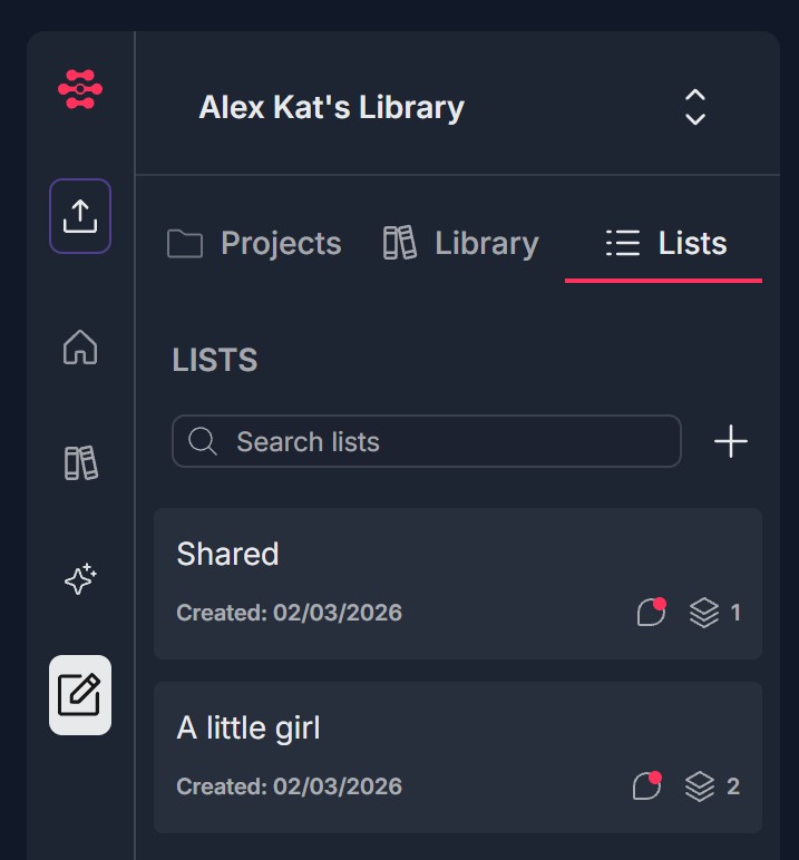 - View lists in a shared project — In the shared project context (e.g., under Projects with the two-person icon, or when the library view reflects the shared project), open the Lists tab. You see all lists created in that project (e.g., Shared, A little girl), each with a Search lists field, creation date, and indicators for comments (e.g., thought bubble with count) and items (e.g., stack-of-papers icon with count). Click a list name to open it and view its items (articles, snippets, chat messages, etc.).
