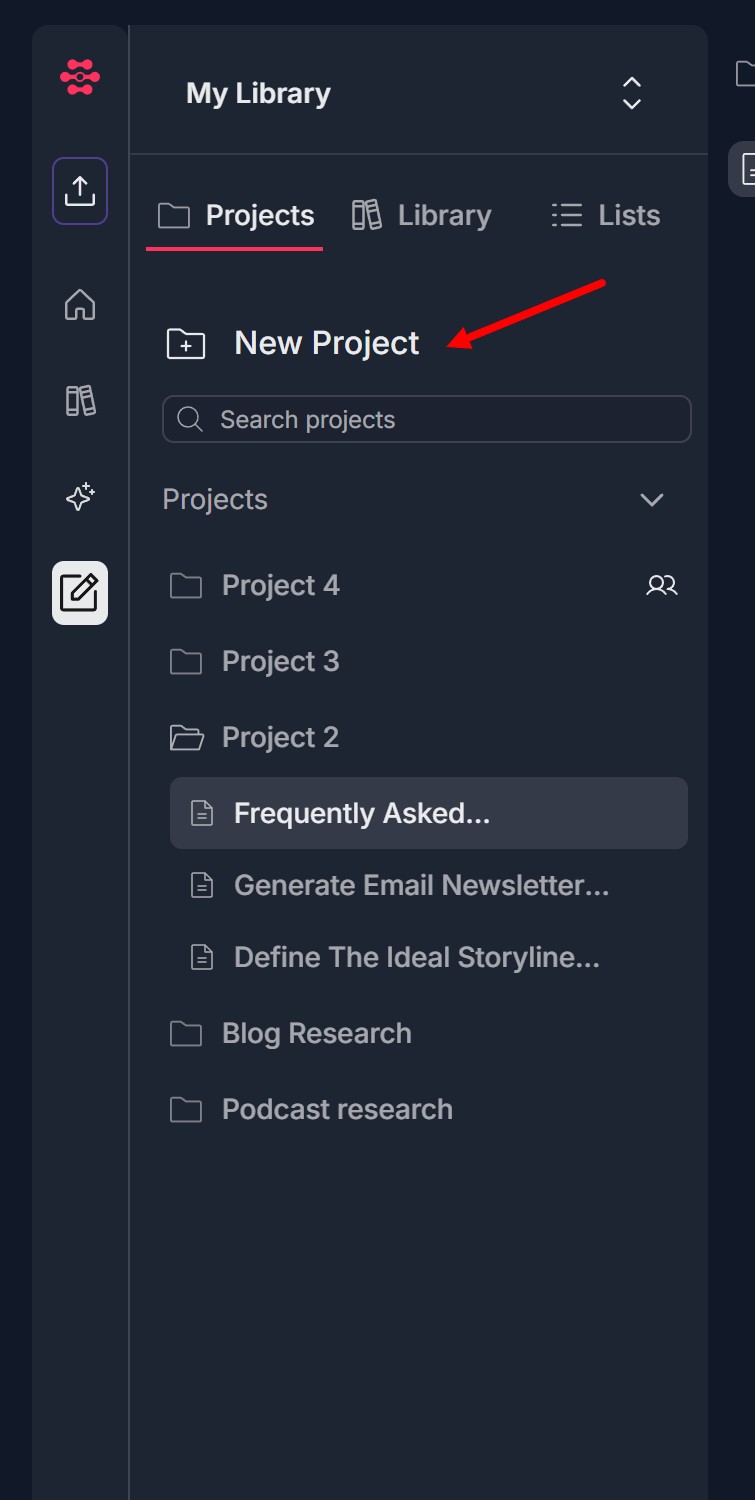 A project is a "parent" to creations - it is the container under which you create and organize your work. Under a project you get an Untitled Document by default, and you can add creations such as Content Mixer, Agent Library, and Blank Document (via + Create New at the top). Documents, mixes, and other outputs created inside a project live under that project in the sidebar. So: Project = parent to creations (documents, mixes, etc.).