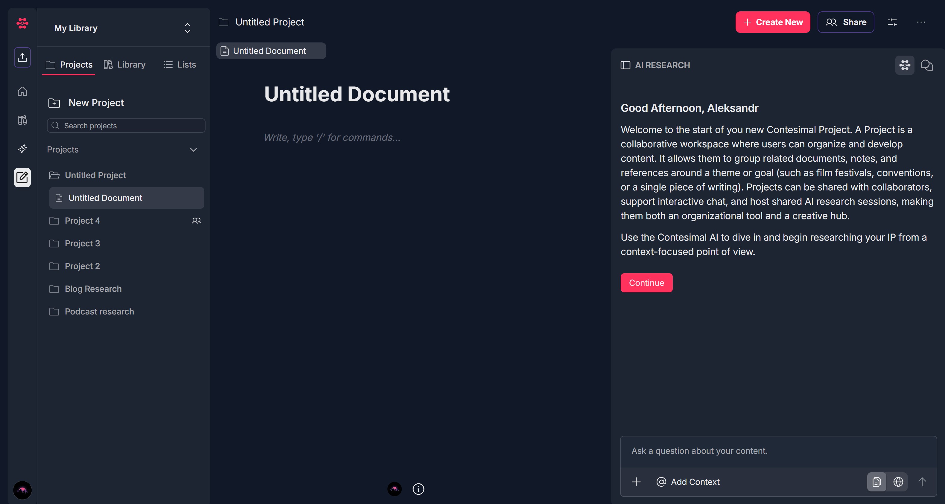 - The right panel shows AI RESEARCH with: A welcome message; A short description of what a project is; The instruction to use the Contesimal AI to dive in and begin researching; A red Continue button; At the bottom: an input "Ask a question about your content." and icons: +, @ Add Context, and icons for document, globe, and upload