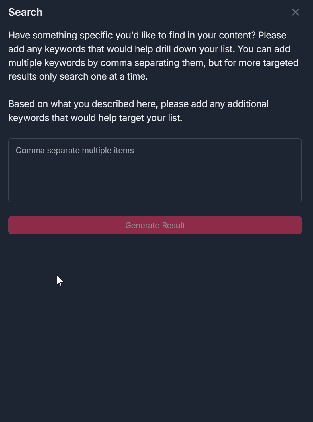 - If you choose Search, a Search modal opens with title "Search", instructions about keywords and comma-separating, a large input "Comma separate multiple items", and a red Generate Result button — click it to run the search