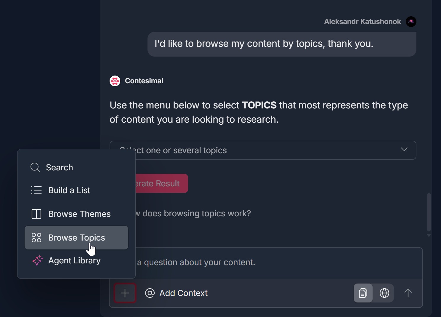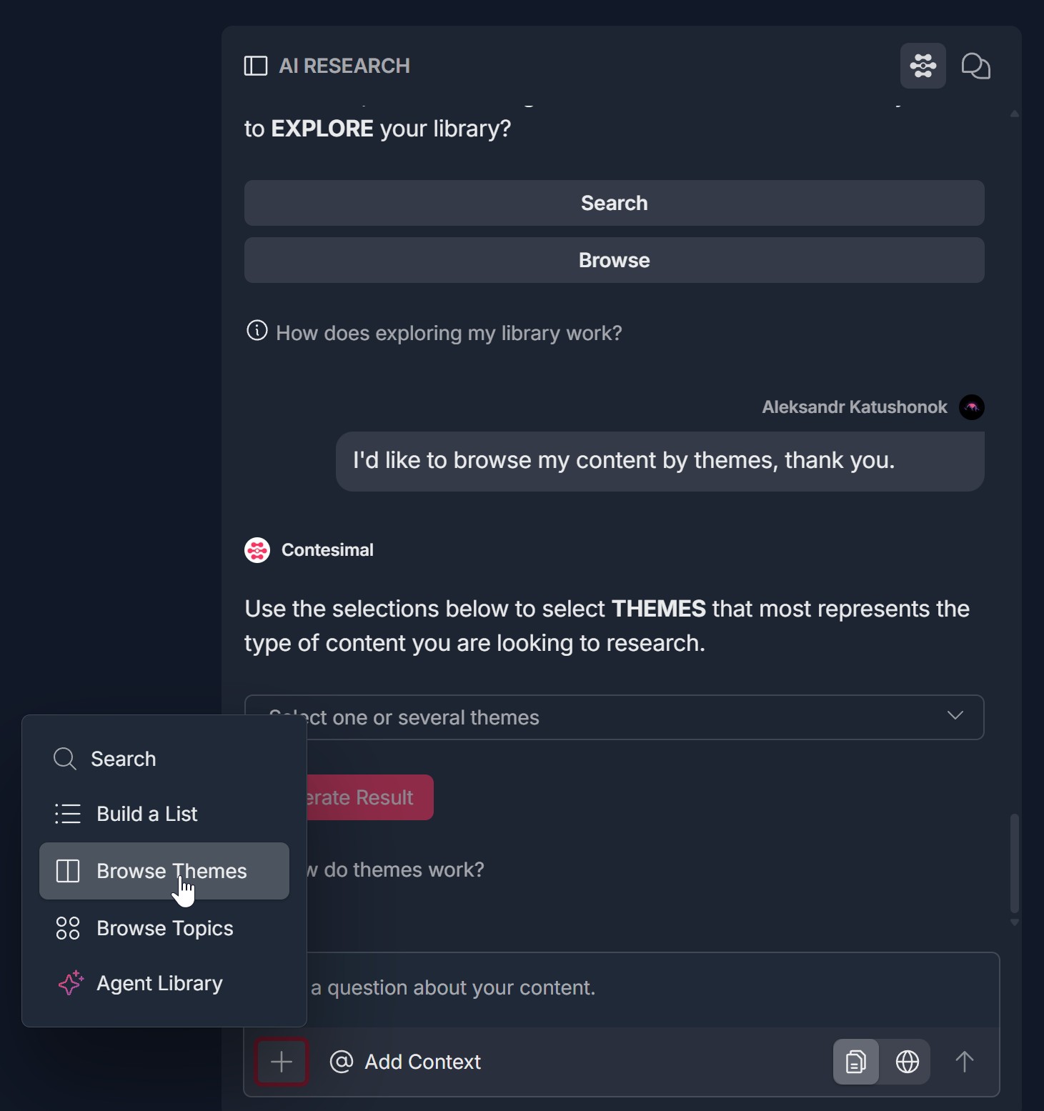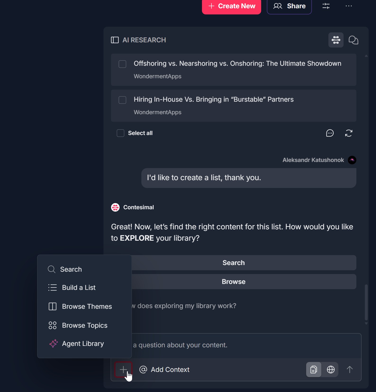 4. Use the "+" menu to explore — Search, Build a List, Browse Themes, Browse Topics, Agent Library