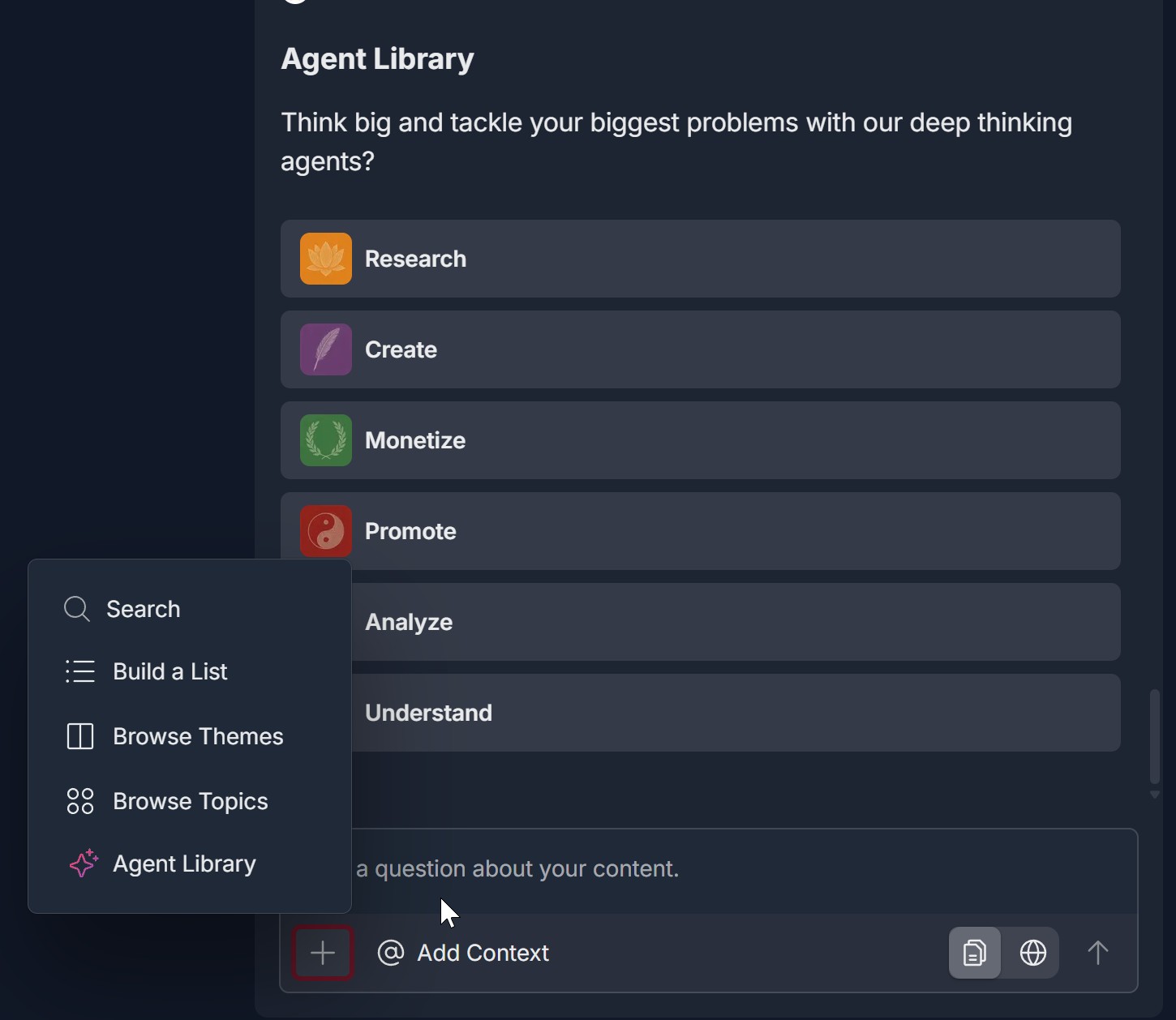- Click the + icon to open a pop-up menu with: Search (magnifying glass), Build a List (list/checklist), Browse Themes (document), Browse Topics (four-circles/grid), Agent Library (sparkle/star)