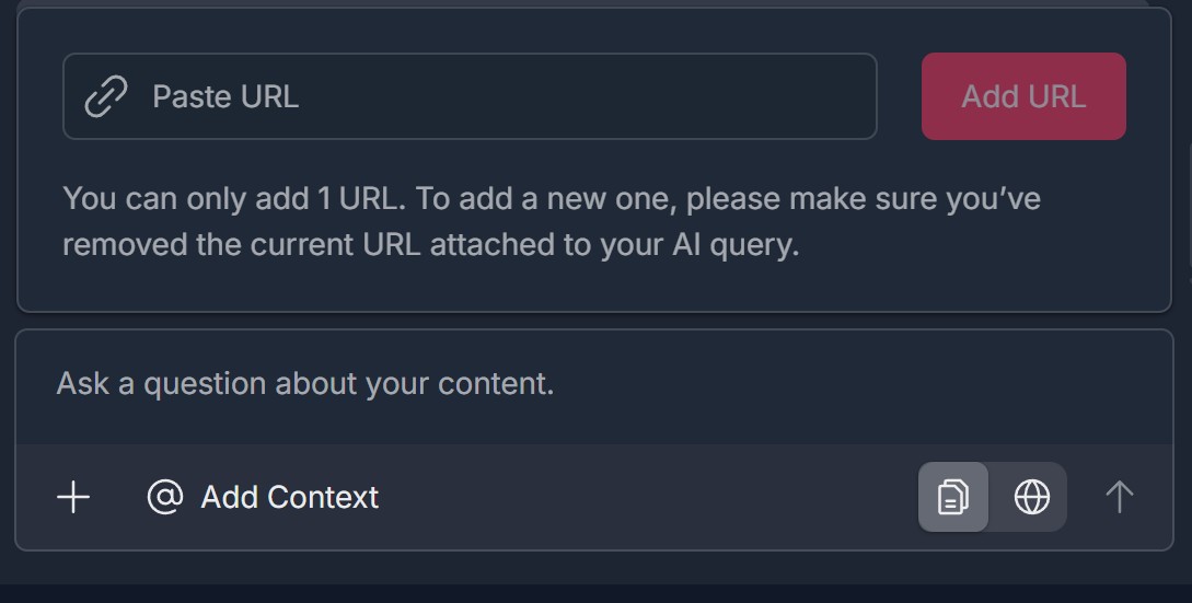 - Issue: You click @ Add Context but the dropdown (Content Library, URL, Add Document) doesn't appear, or you choose an option but content doesn't attach to your project or AI query.