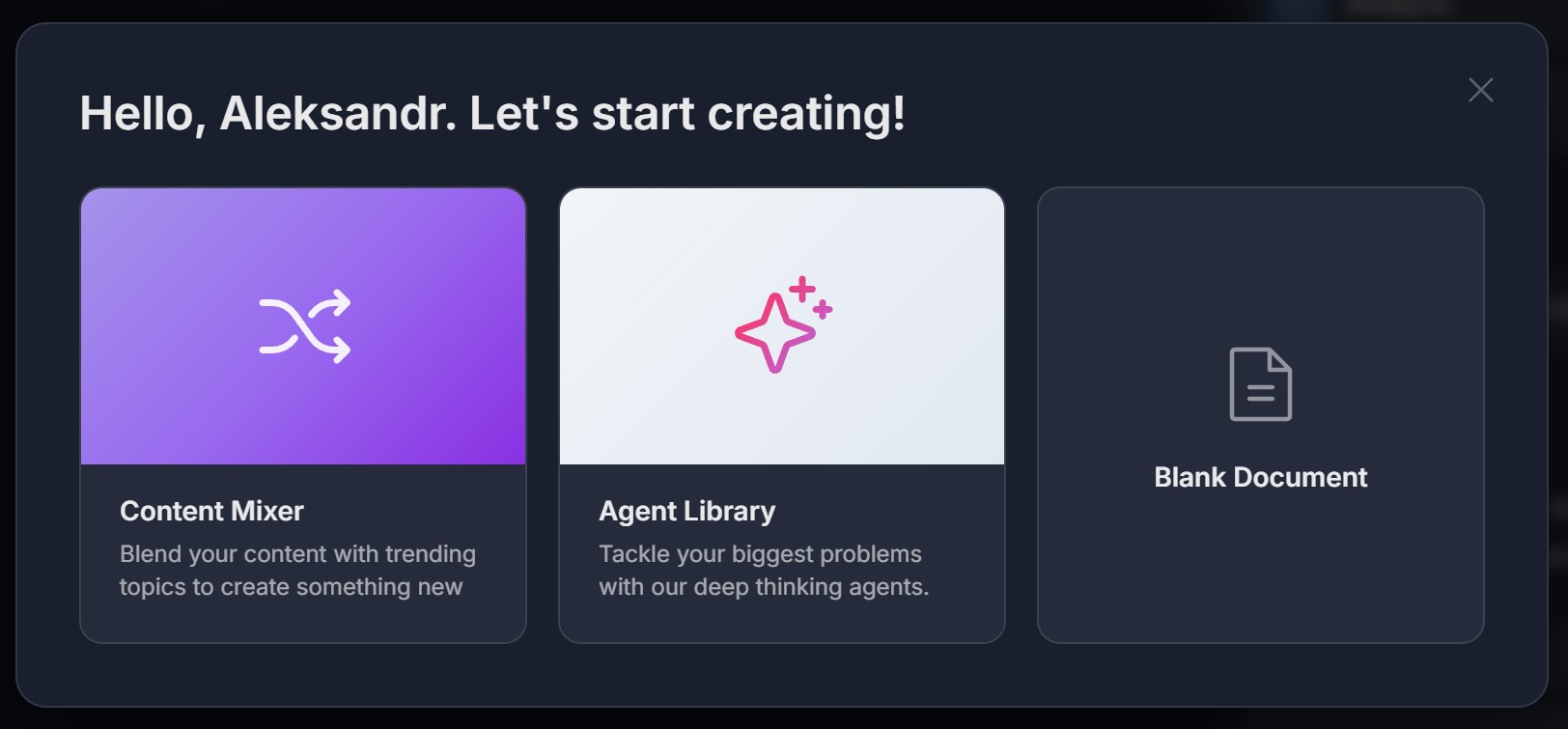 - A modal opens: "Hello, [Name]. Let's start creating!" with three cards: Content Mixer (purple, "Blend your content with trending topics to create something new"), Agent Library, Blank Document