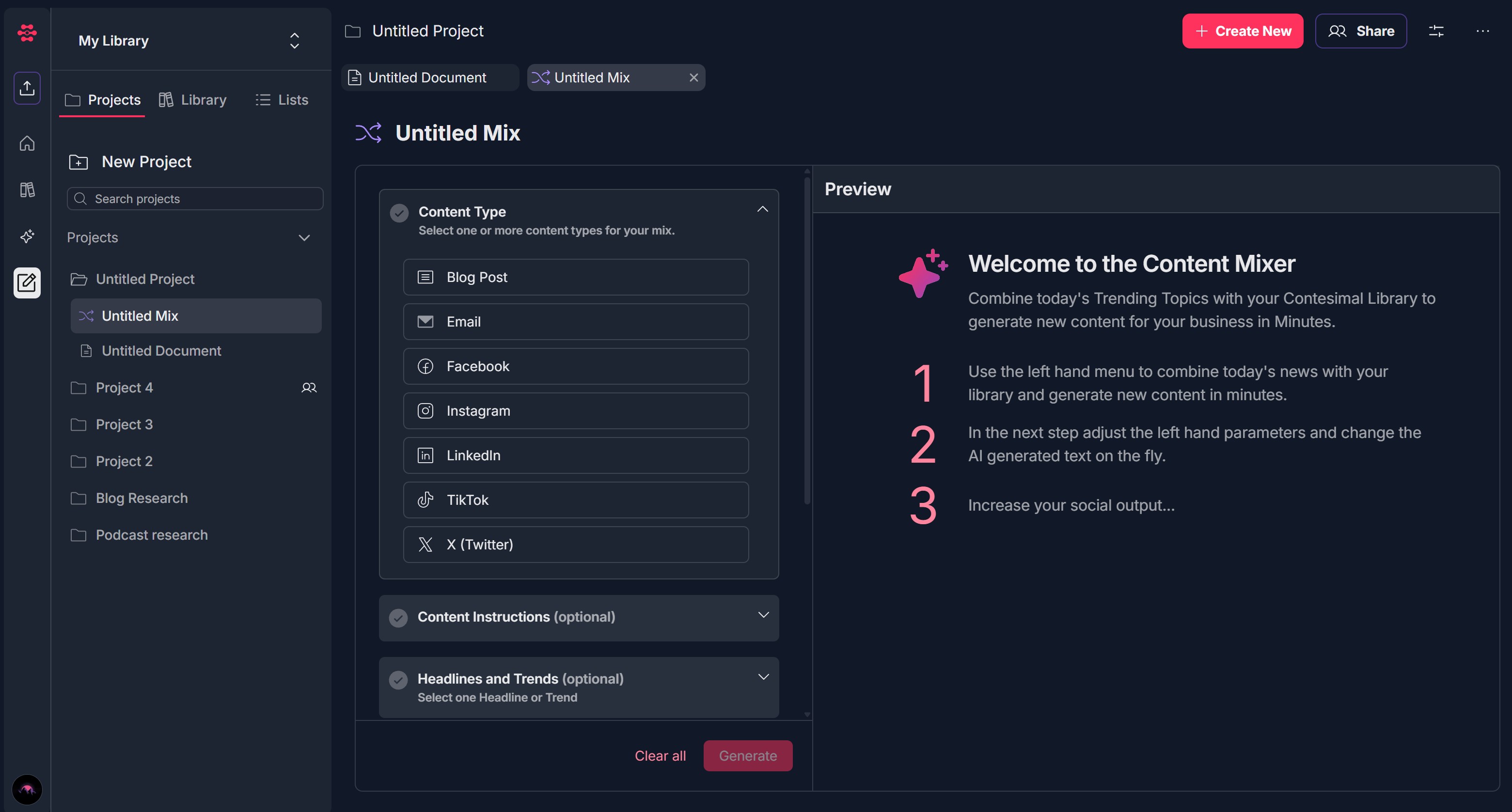 1. Under a project, click + Create New at the top and select Content Mixer