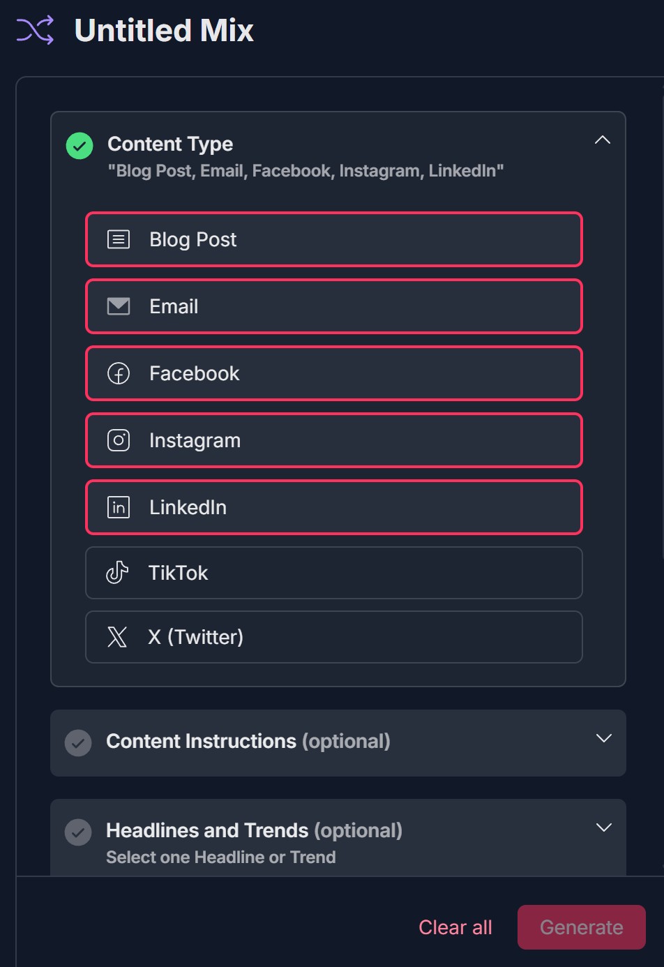 - One mix, multiple formats — Select one or more content types (Blog Post, Email, Facebook, Instagram, LinkedIn, TikTok, X (Twitter)); the mixer generates tailored content for each in one run, so you don't recreate the same idea format by format.