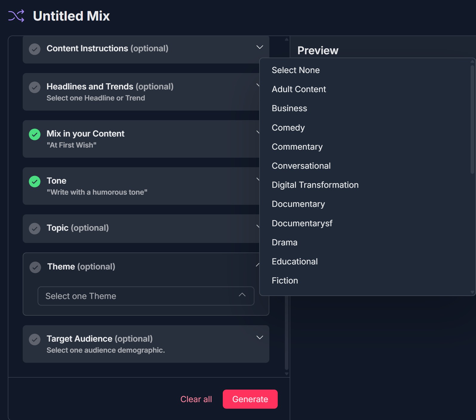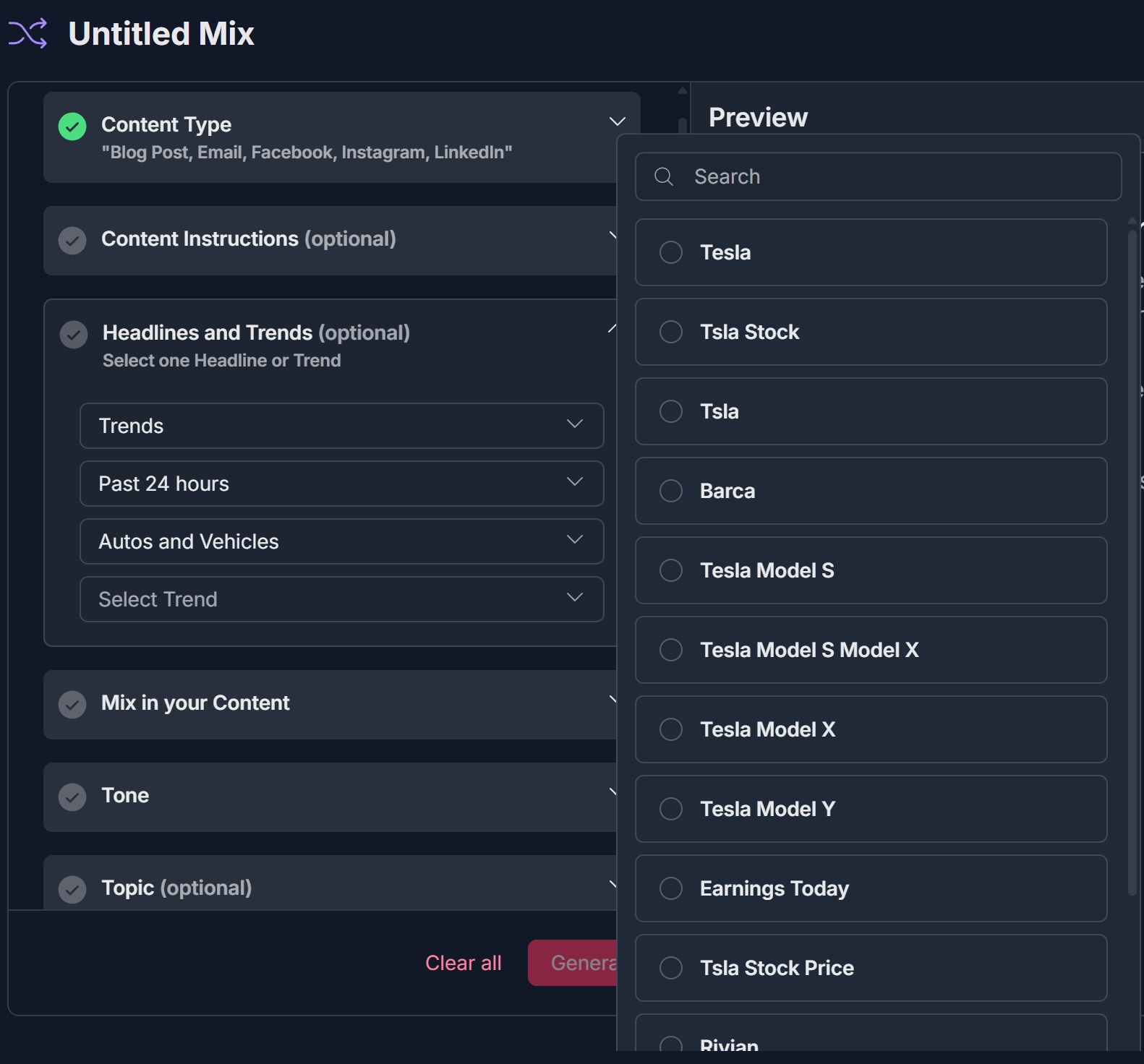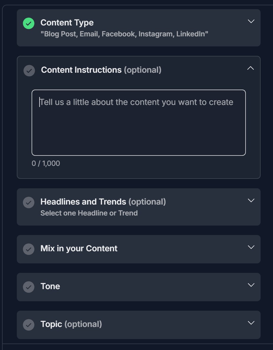 - Left panel: Configuration sections (Content Type, Content Instructions optional, Headlines and Trends optional, Mix in your Content, Tone, Topic optional, Theme optional, Target Audience optional); each with checkmark and expand/collapse arrow