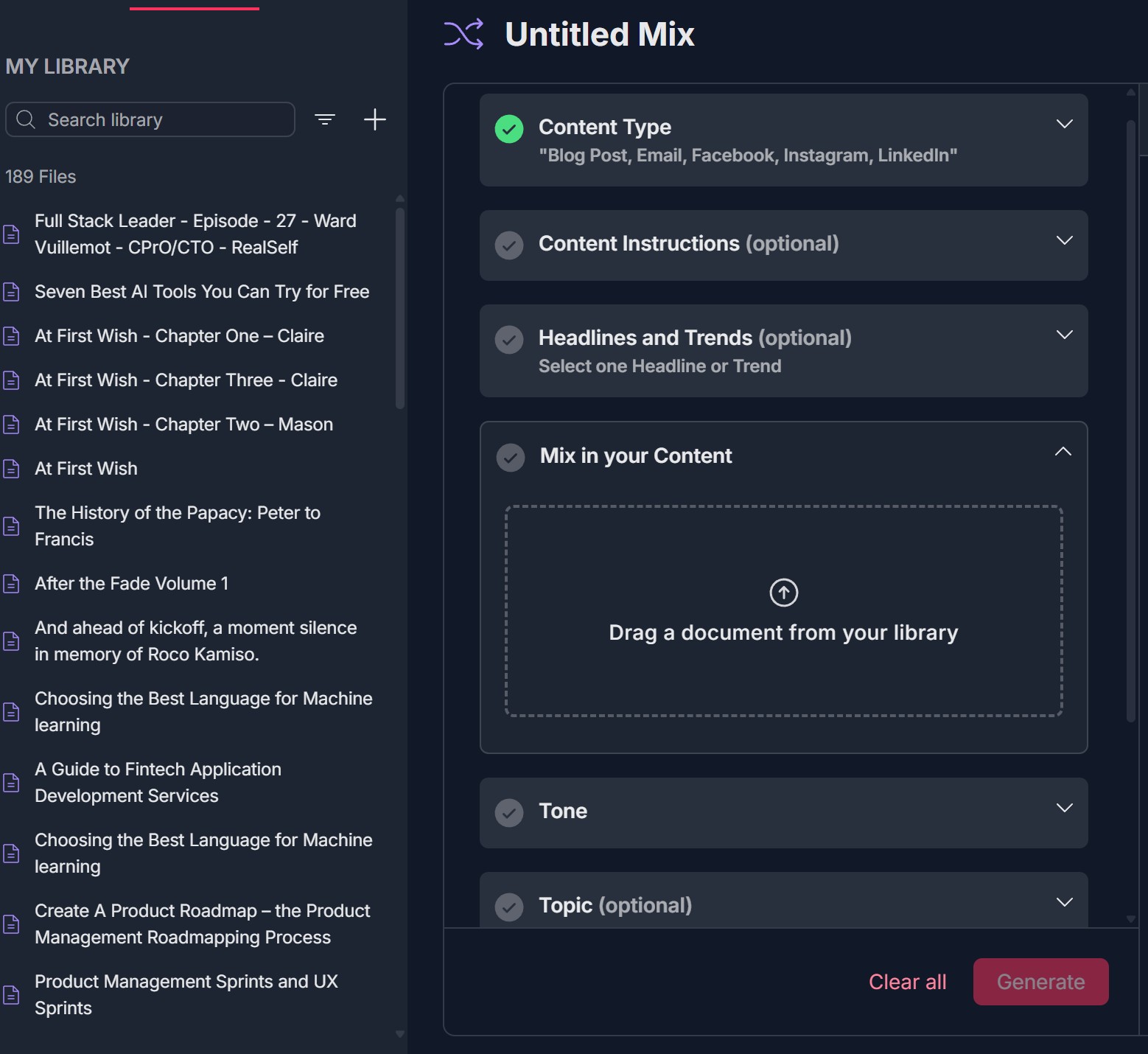 - Expand Mix in your Content; MY LIBRARY (Search library, document list) or dashed box "Drag a document from your library"; drag or select a document (e.g., "At First Wish"); section shows green checkmark when set