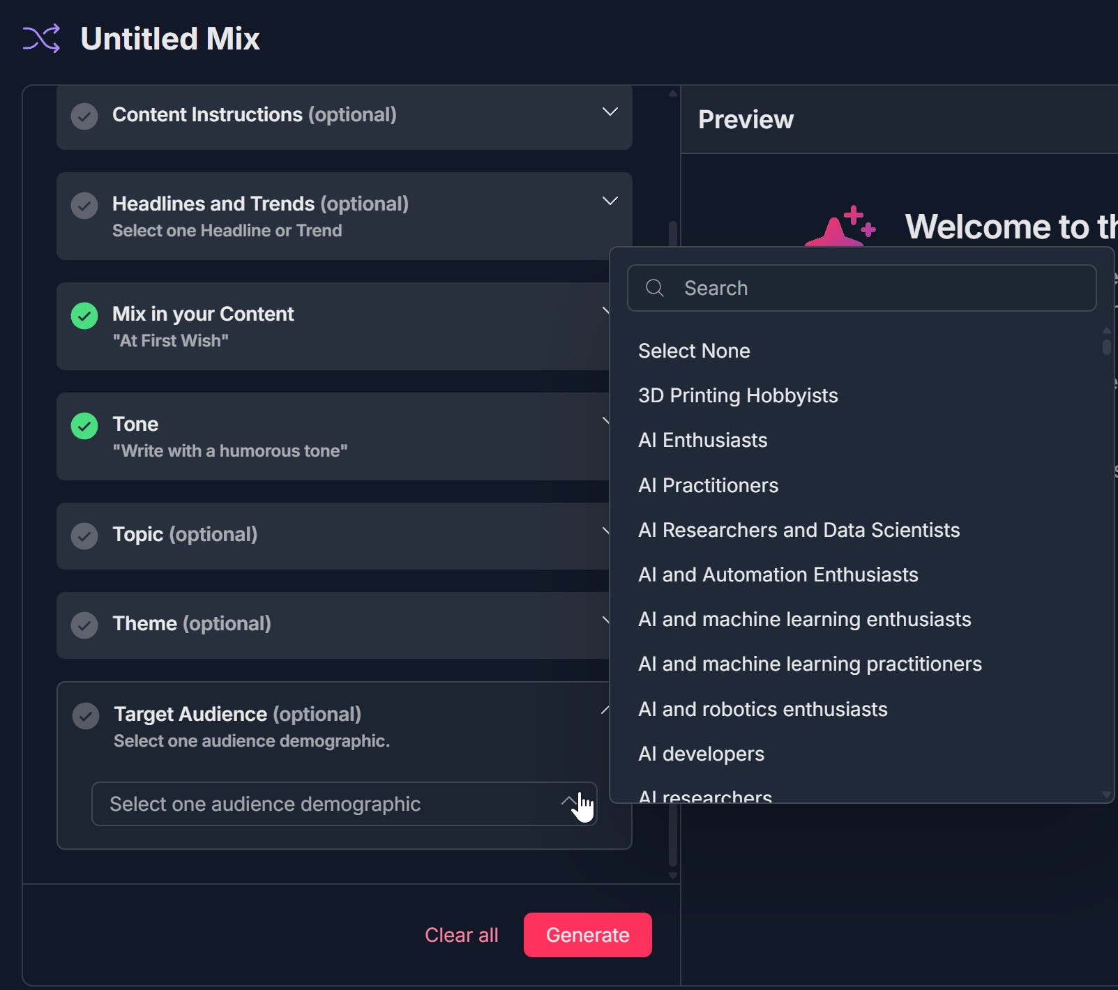 - Right panel: Preview with "Welcome to the Content Mixer." and instructions; bottom left: Clear all and Generate (red)