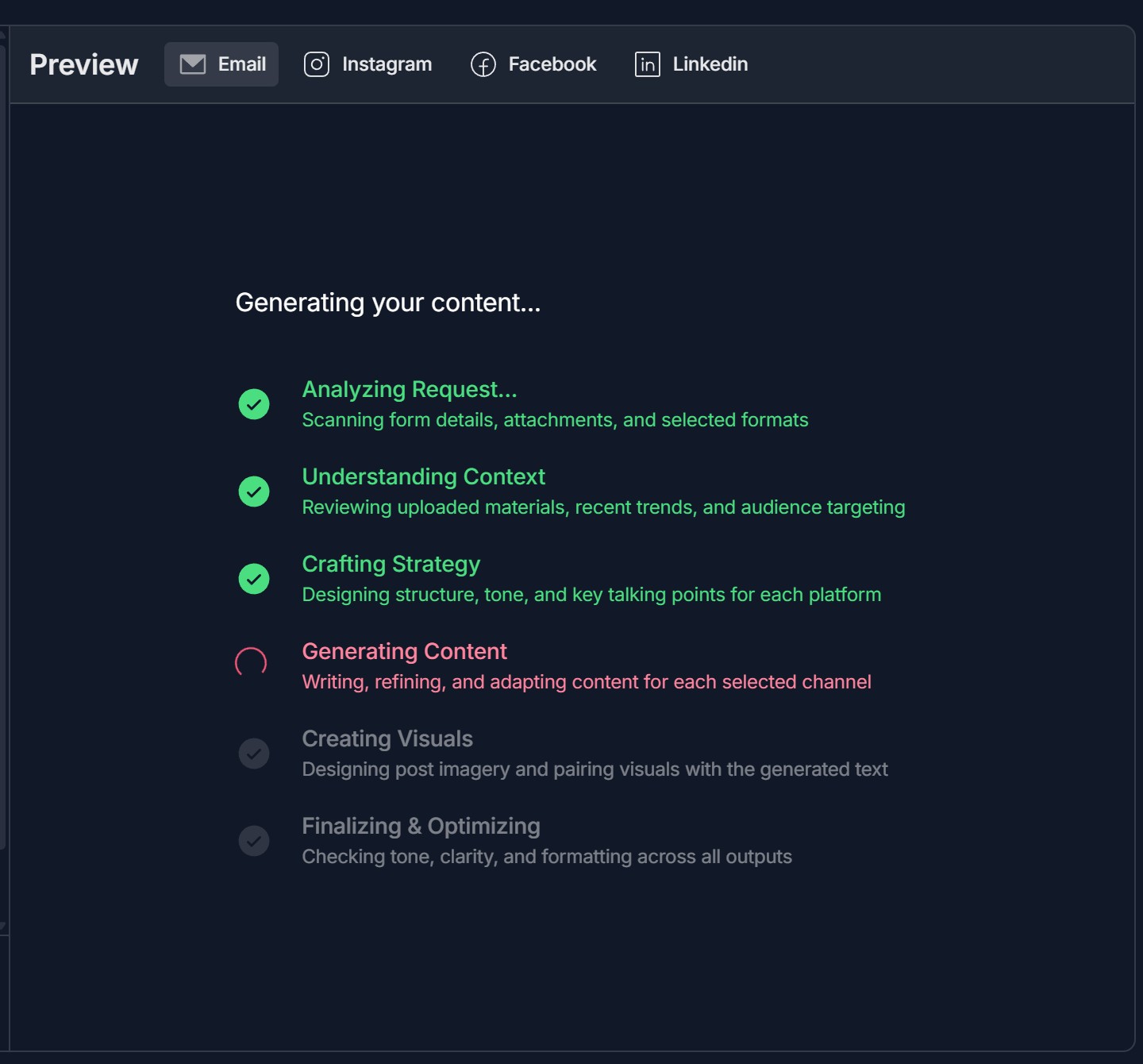 - Preview shows "Generating your content..." with steps: Analyzing Request, Understanding Context, Crafting Strategy, Generating Content, Creating Visuals, Finalizing & Optimizing; wait for completion