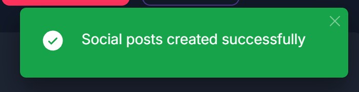 - In Preview, click the red Edit and Publish button; system saves/publishes; green toast "Social posts created successfully" with checkmark and X to dismiss