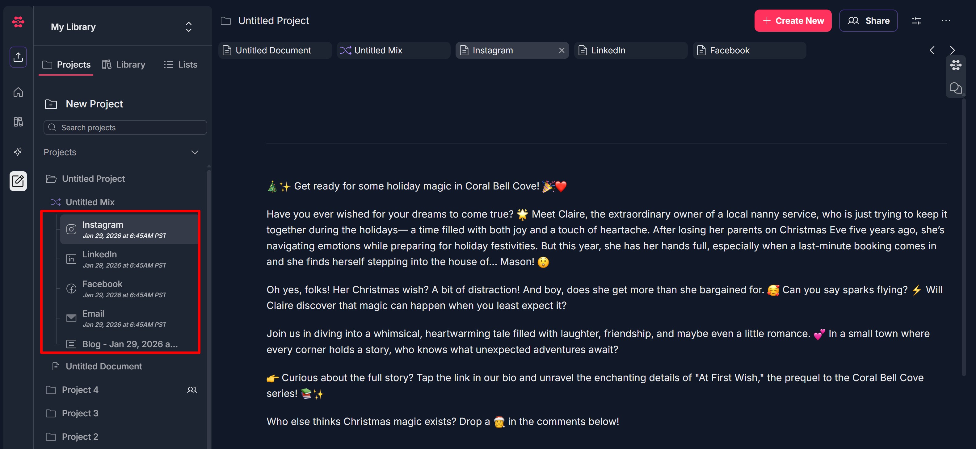 - Left sidebar: under project (e.g., Untitled Project), Untitled Mix shows generated items (Instagram, LinkedIn, Facebook, Email, Blog - date); click any item to open in main area; content remains part of project and mix