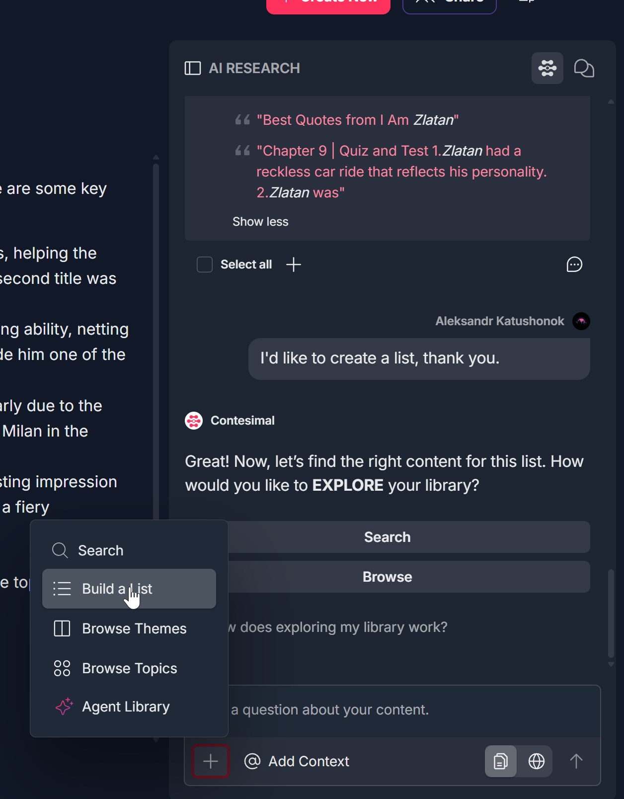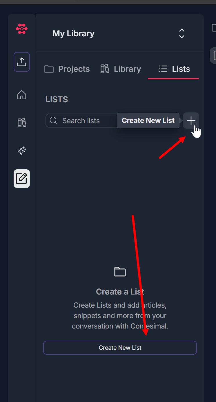 - Click Create New List (button next to "Search lists") or the + icon next to it; or use the large Create New List button in the center if you have no lists yet. The central prompt may say: "Create a List" — "Create Lists and add articles, snippets and more from your conversation with Contesimal."