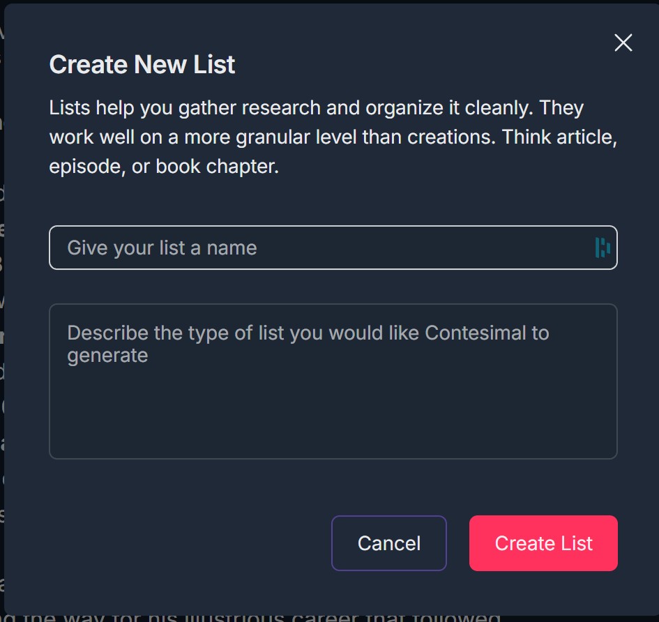 - A Create New List modal opens with: Title: "Create New List"; Informative text: "Lists help you gather research and organize it cleanly. They work well on a more granular level than creations. Think article, episode, or book chapter."; Give your list a name — text input; Describe the type of list you would like Contesimal to generate — multi-line field (optional); Cancel (purple) and Create List (red) buttons; X in the top right to close.