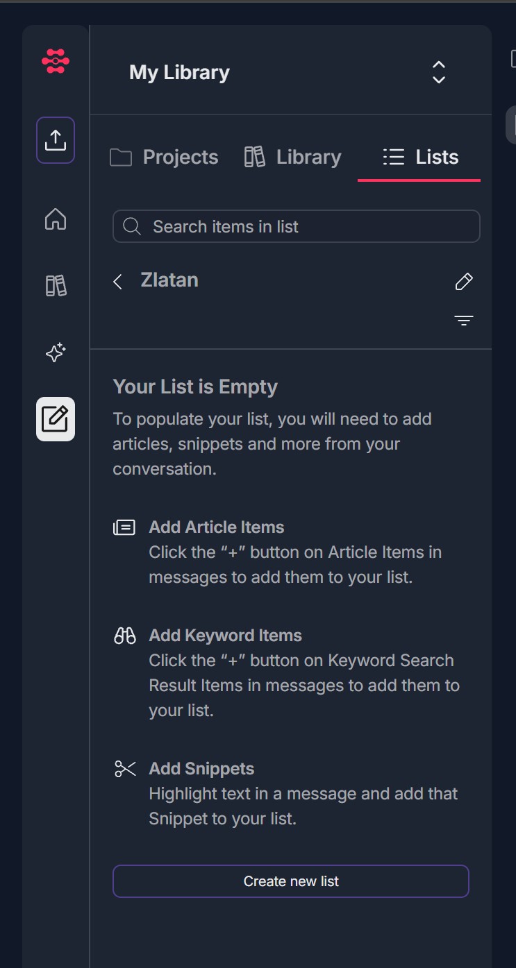 - You see "Your List is Empty" and the message: "To populate your list, you will need to add articles, snippets and more from your conversation."