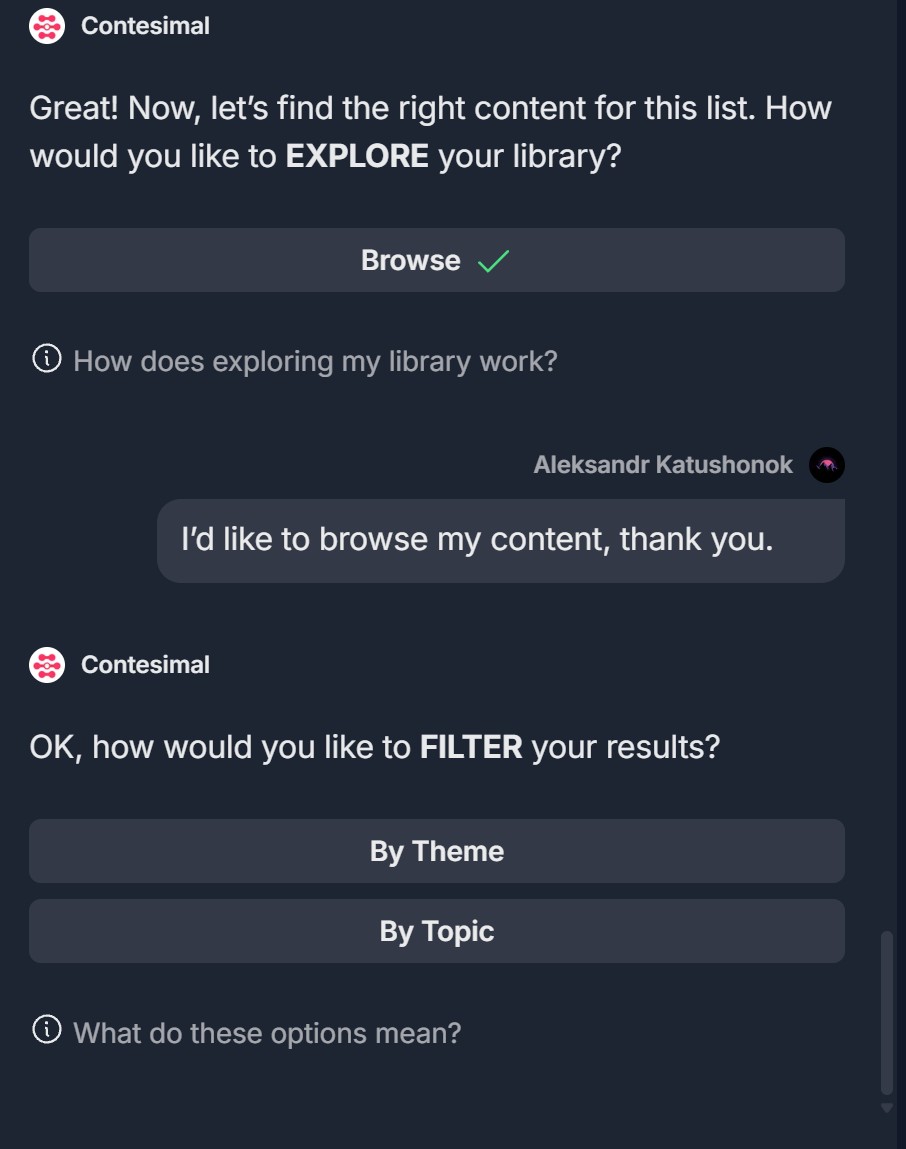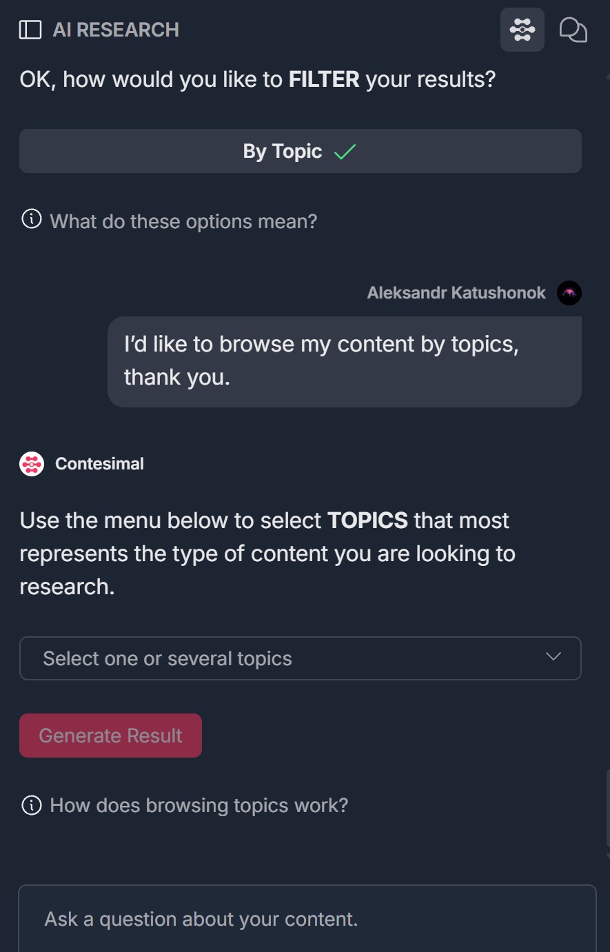 - Browse your content — If you choose Browse, Contesimal asks: "How would you like to FILTER your results?" with buttons By Theme and By Topic. An info link "What do these options mean?" may appear. Choose By Theme or By Topic (see step 5), then select themes or topics and click Generate Result.