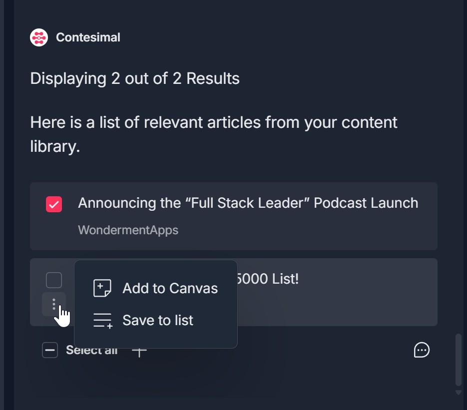 - The three-dots menu offers Add to Canvas (document-with-plus icon) and Save to list (list-with-plus icon)