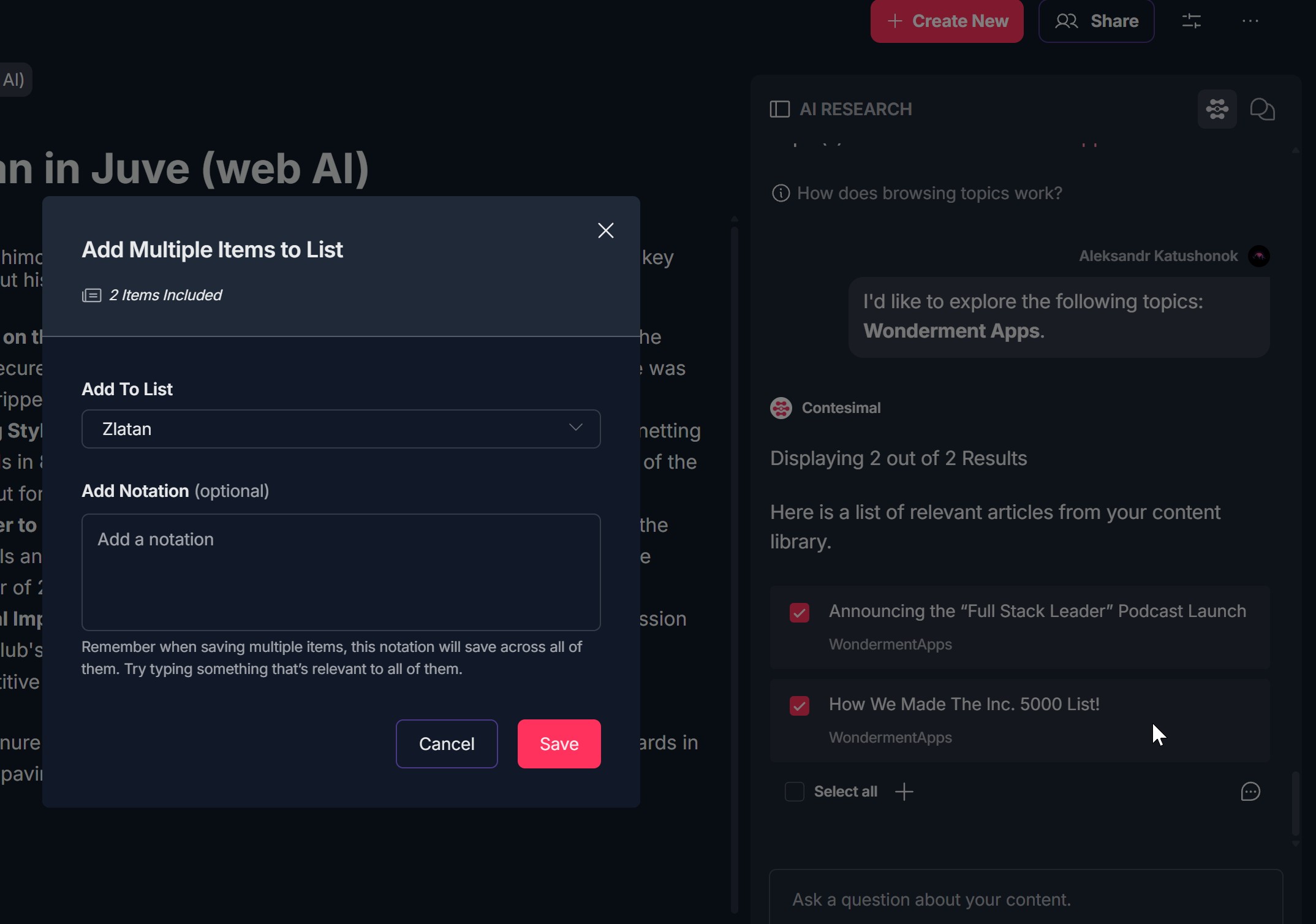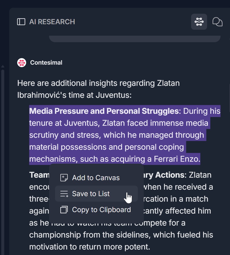 - Snippets as well as full articles — You can add full articles from results to a list, or select a passage of text in the AI Research tool and Save to list to add just that snippet.
