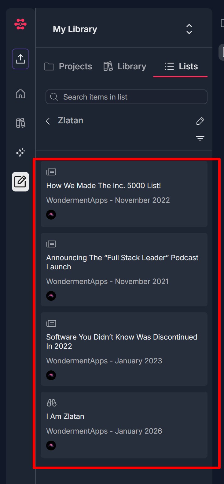 - Each item shows title, source and date (e.g., "WondermentApps - January 2026"), and an icon (document for articles; chain/snippet icon for snippets)