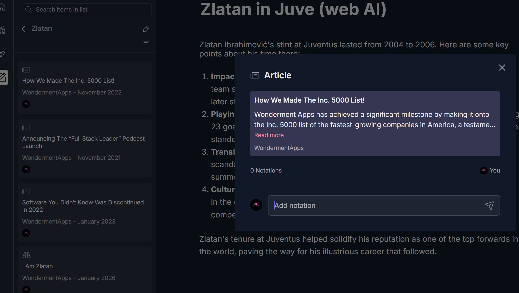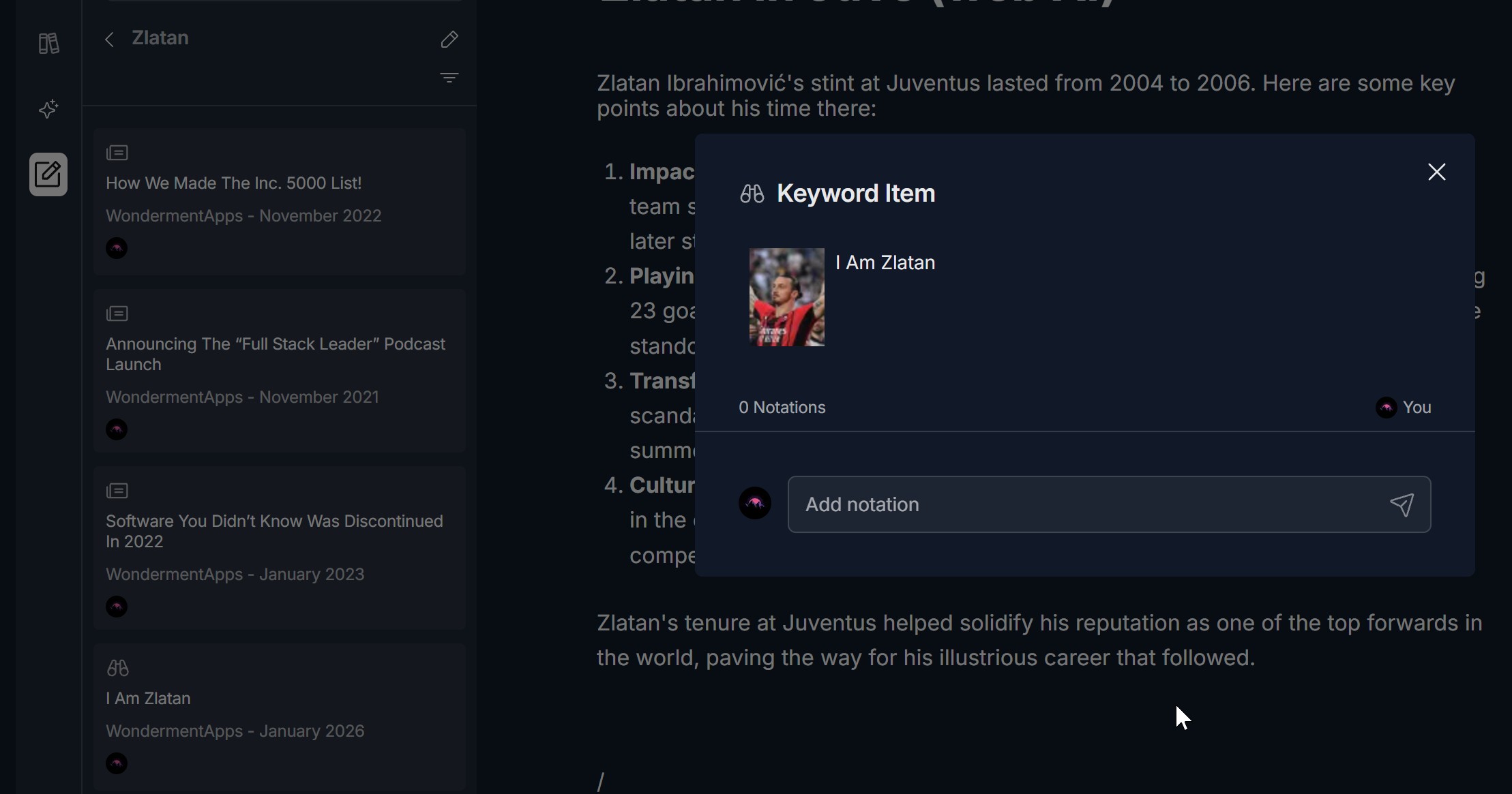 - Click an item to open its detail view: an Article (or Keyword Item) modal shows title, description, Read more link, source, and Notations — "0 Notations" or existing notes, with an Add notation input and send icon. You can add or view notations here