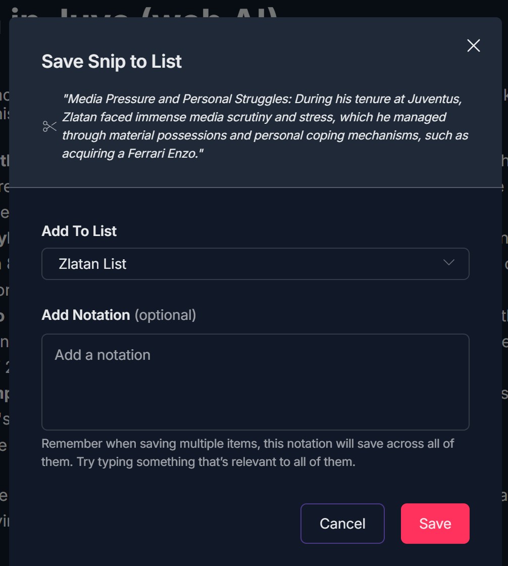 - A Save Snip to List modal opens: The selected snippet text is shown at the top (with a scissors icon); Add To List — dropdown to choose the list (e.g., "Zlatan List"); Add Notation (optional) — input "Add a notation" with the note: "Remember when saving multiple items, this notation will save across all of them. Try typing something that's relevant to all of them."; Cancel (purple) and Save (red) buttons; X to close.
