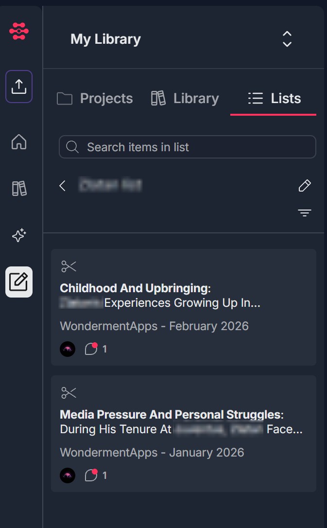 - The new snippet appears in the list with: A scissors icon (indicating it is a snippet); The snippet title or preview (e.g., "Childhood And Upbringing: Zlatan's experiences growing up in..." or "Media Pressure And Personal Struggles: During his tenure at Juventus..."); Source and date (e.g., "WondermentApps - February 2026") if shown; A comment/notation count (e.g., "1" if you added a notation) and a You or profile icon