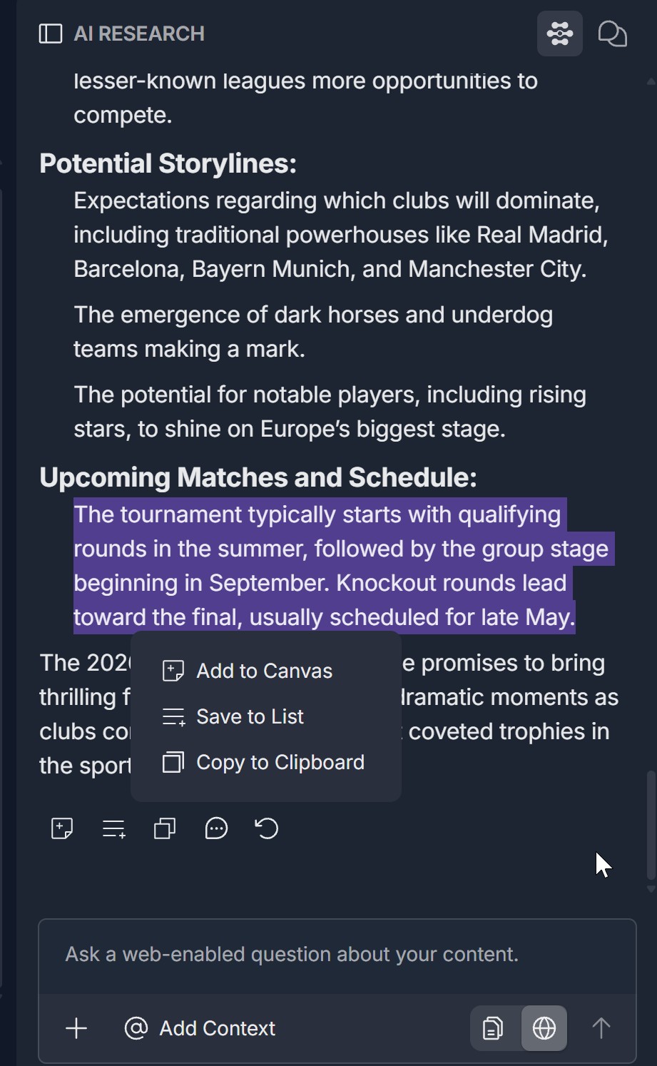 - A context menu appears over or near the selection with options such as Add to Canvas, Save to List, and Copy to Clipboard