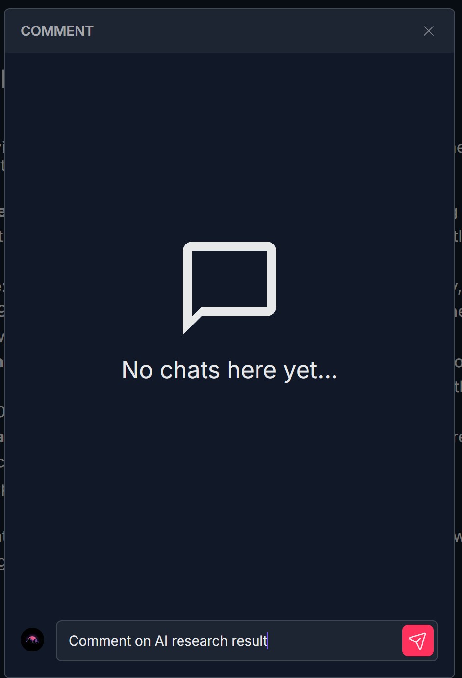 - At the bottom: your avatar on the left, an input field with placeholder Add comment or Comment on AI research result, and a paper airplane (send) icon on the right
