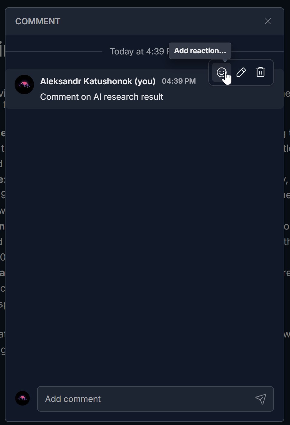 - Add comments — Type in the Add comment input at the bottom of the panel (or placeholder Comment on AI research result) and send with the paper airplane (send) icon. Your comment appears in the list with your name and timestamp.