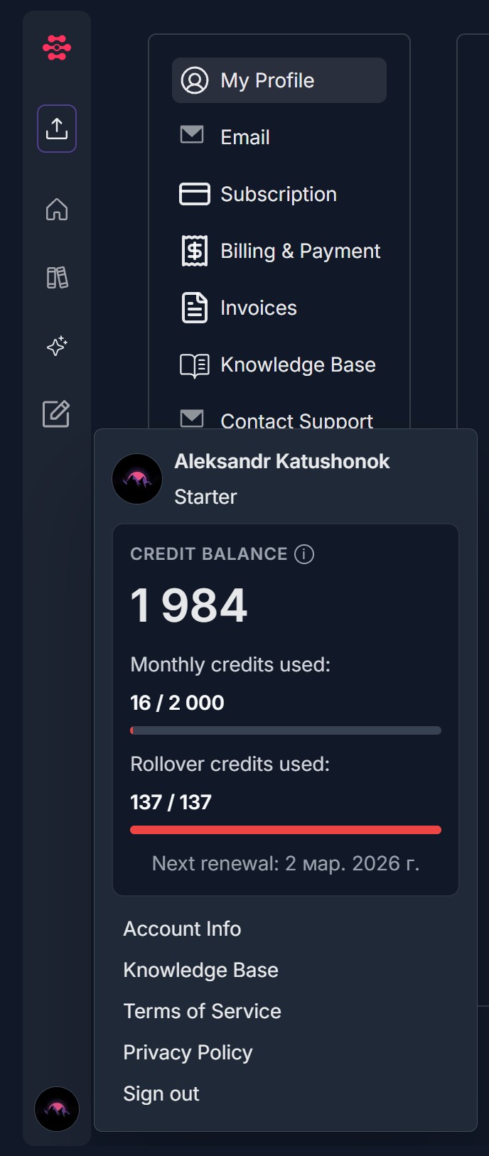 - Monthly credits used (e.g., 16 / 2 000) with a progress bar