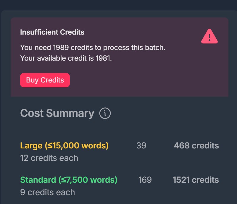 - The message states how many credits you need vs. your available balance (e.g., You need 1989 credits to process this batch. Your available credit is 1981.)