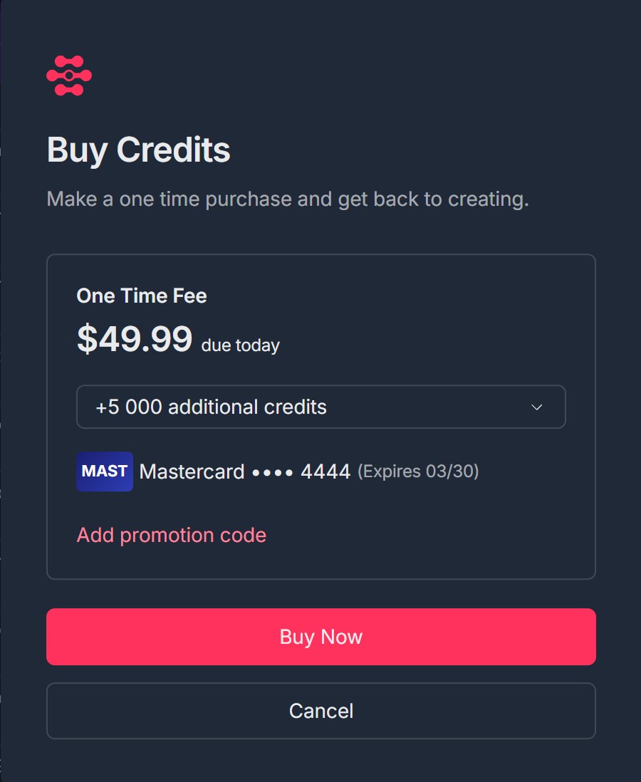 - You'll see: One Time Fee (e.g., $49.99 due today), Credit pack (e.g., +5 000 additional credits), Payment method (e.g., MAST Mastercard .... 4444, Expires 03/30)