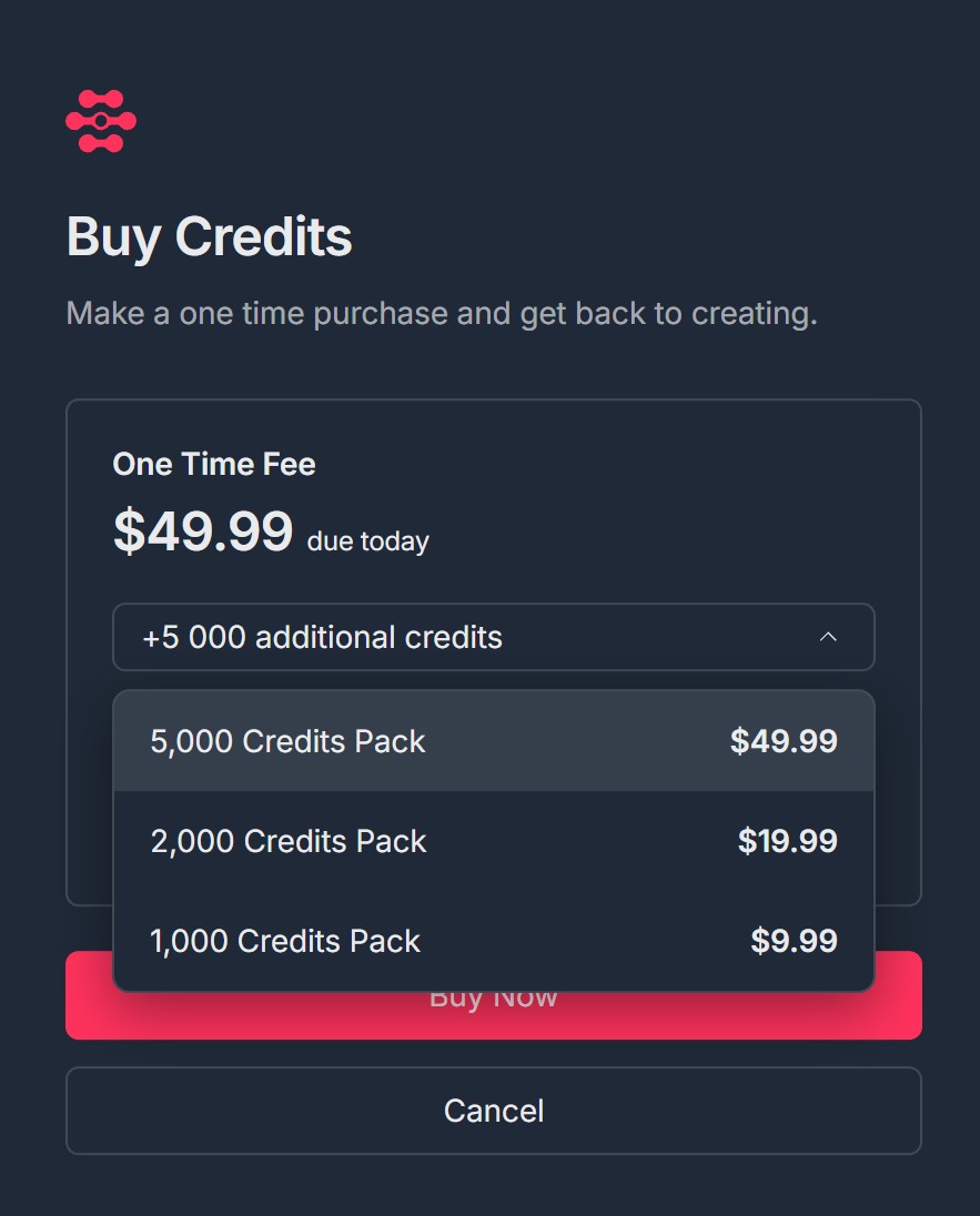 - Select a credit pack from the list (e.g.): 5,000 Credits Pack — $49.99 (often pre-selected), 2,000 Credits Pack — $19.99, 1,000 Credits Pack — $9.99