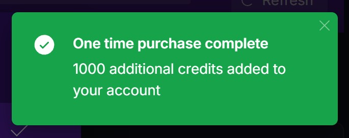 - Secondary message: e.g., 1000 additional credits added to your account (amount matches the pack you bought)